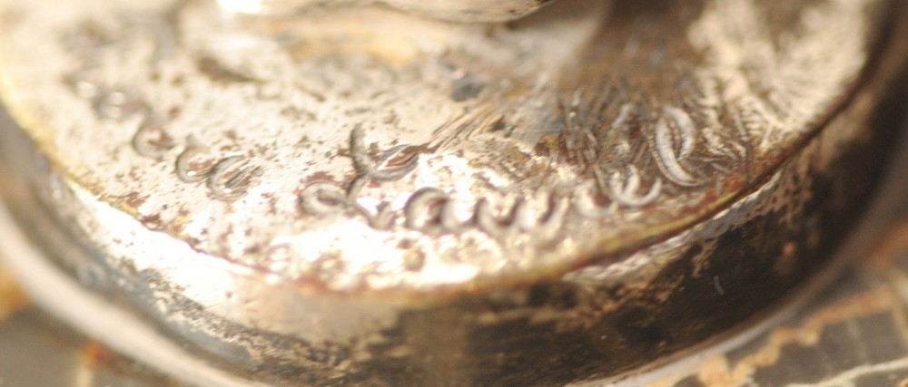 sehr guter Zustand insgesamt, eine beschädigte Stelle bis zur unteren Ecke der Basis, wenige Gebrauchsspuren, altersbedingte Abnutzung an Silber, aber insgesamt noch sehr ansprechend.