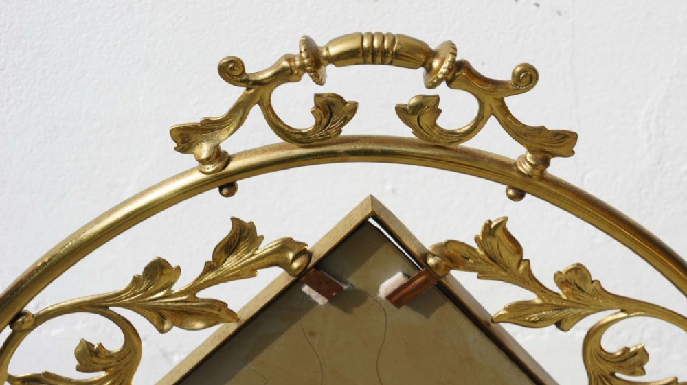 Eleganter dekorativer Feuerschirm aus dem frühen 20. Jahrhundert (ca. 1910-20) mit einem diamantförmig abgeschrägten Mittelspiegel und Blattgussrahmen und abnehmbaren Schraubfüßen. Rundum in hervorragendem Zustand. Keine Beschädigung oder übermäßiger Verschleiß, hintere Endbearbeitung komplett und in gutem Zustand. Gereinigt, aber nicht poliert. Dieser Artikel ist antik. Das Herstellungsdatum wurde als 1920 deklariert.
