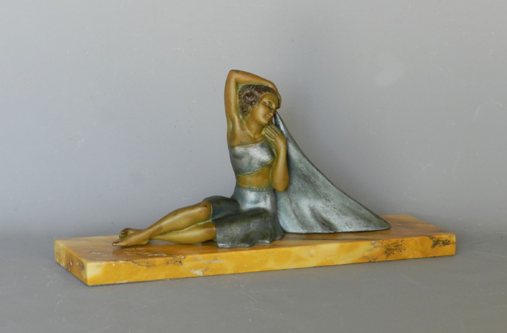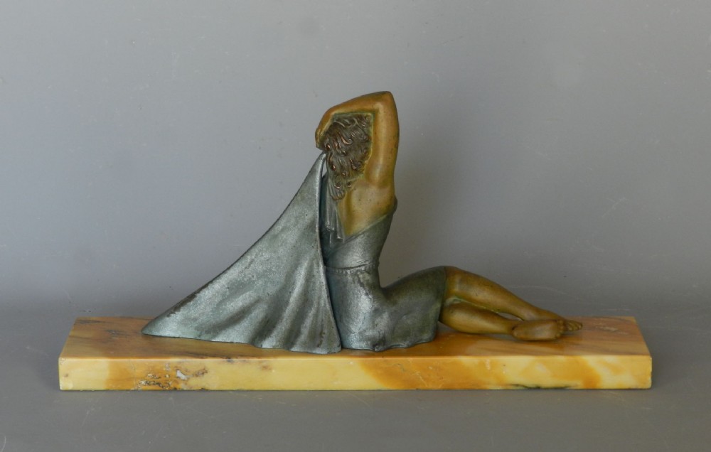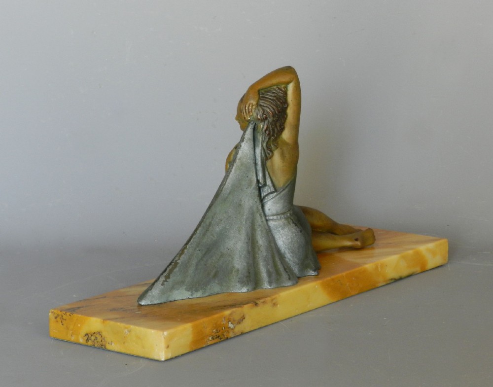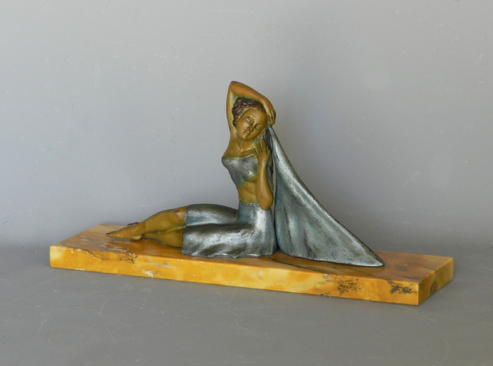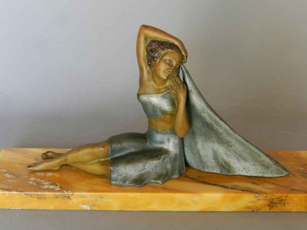 Antike Art Deco -Figur einer Dame mit Umhang auf Marmorbasis, 1930 gefertigt in Frankreich.