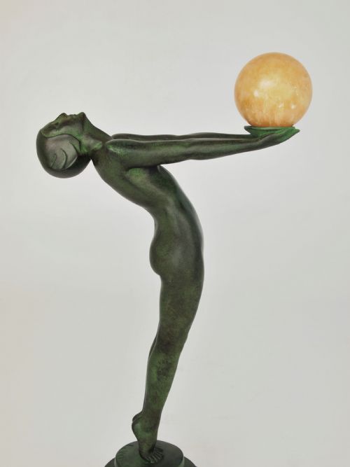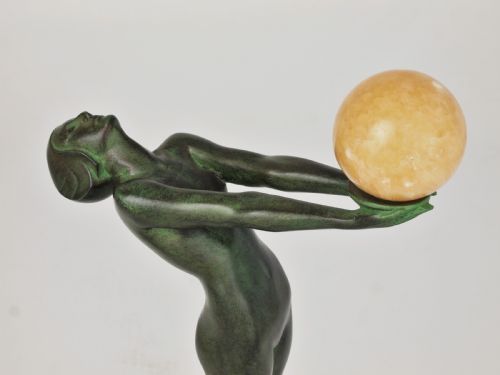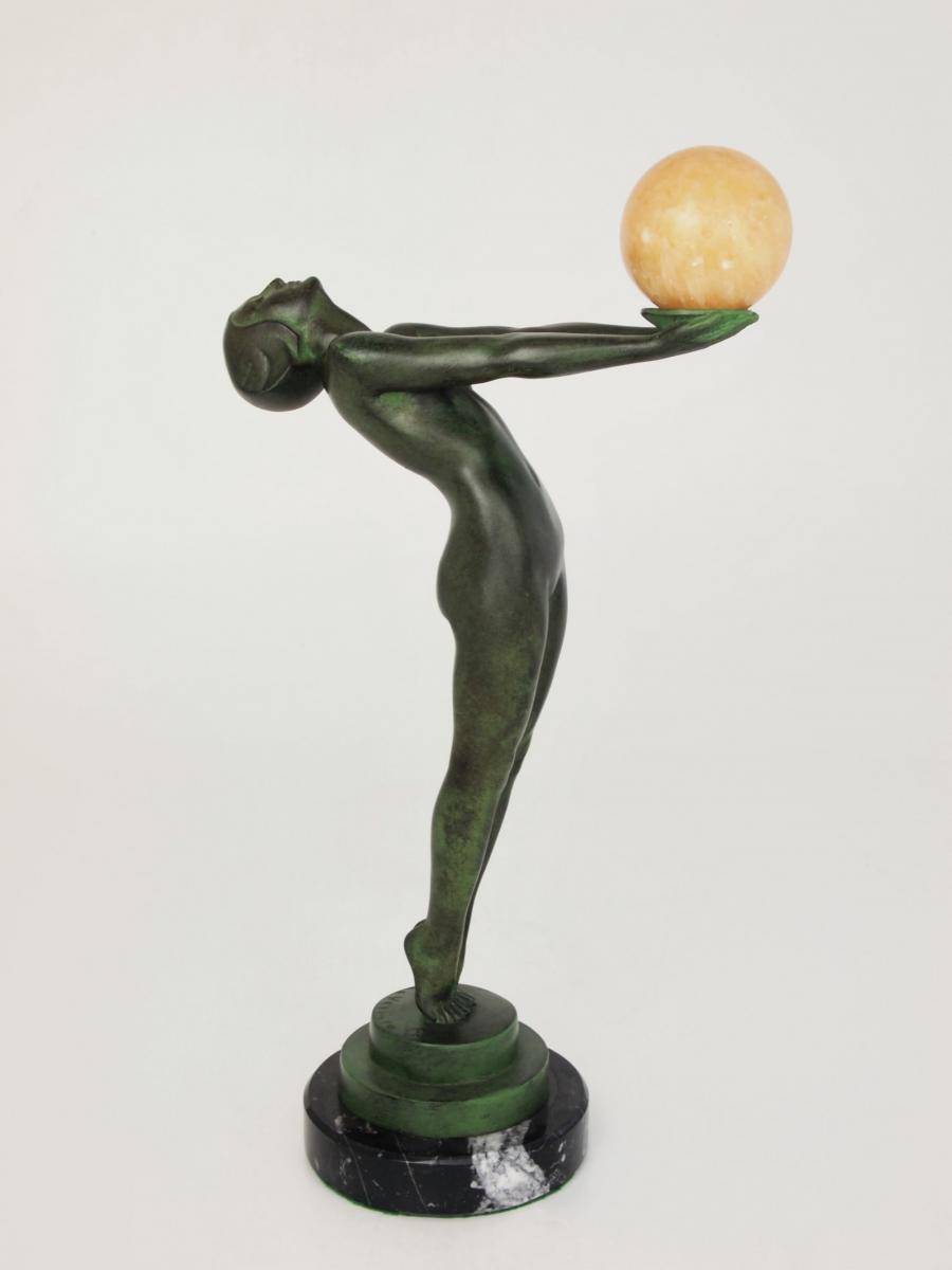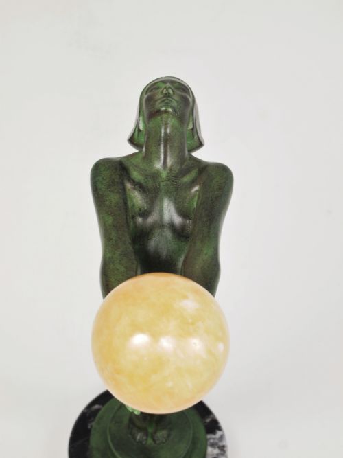 Antike Art-Deco-Skulptur "Lueur" einer Frau mit großem Ball. Max Le Verrier, 1930.