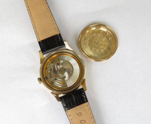 Sie hat einen Durchmesser von 35 mm ohne die Aufzugskrone und die Stollen. Das Gehäuse besteht aus 9 Karat Gold. In dem verschraubten Gehäuse für London 1968 befinden sich Markenzeichen. Das Gehäuse befindet sich in gutem Zustand, nur ein paar leichte Kratzer auf der Rückseite.