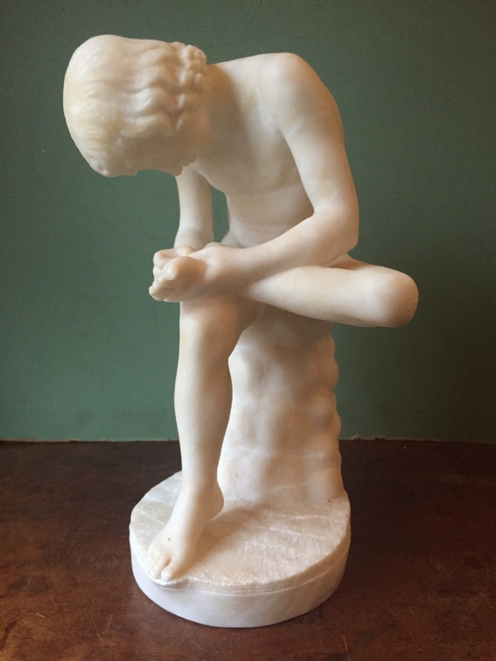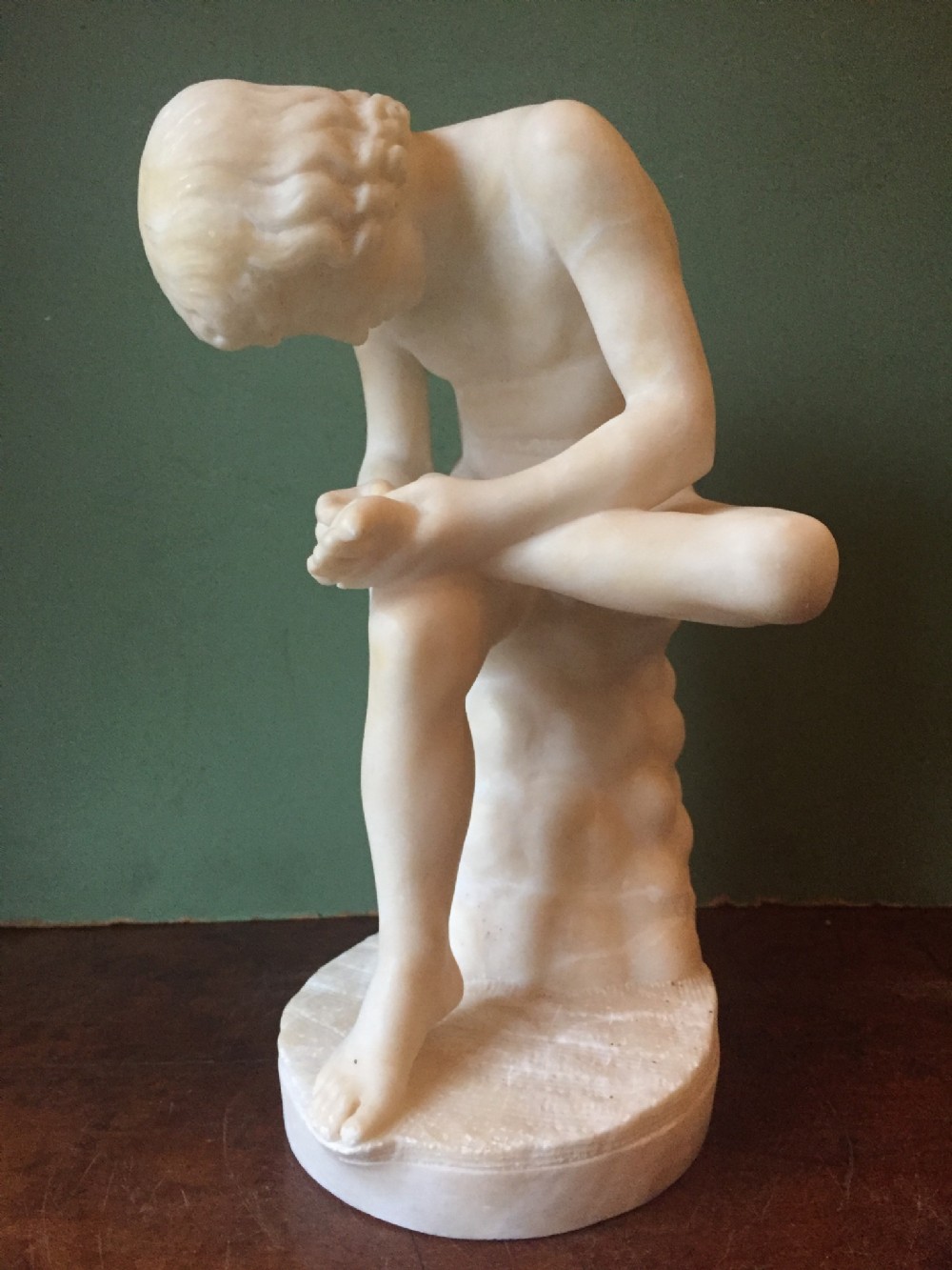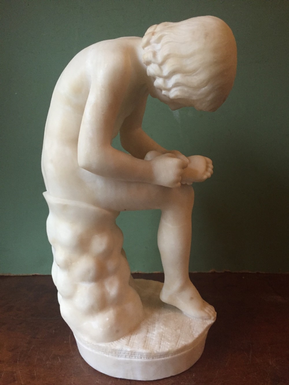gut geschnitzte Alabaster-Reduktion von "lo spinario", der ikonischen antiken Statue des kleinen Jungen, der auf einem Felsen sitzt, der in tiefer Konzentration gezeigt wird, während er daran arbeitet, einen Dorn von der Fußsohle zu entfernen.