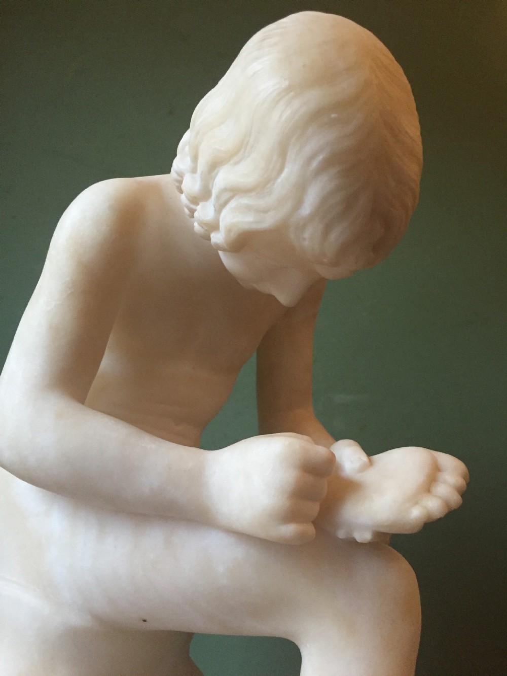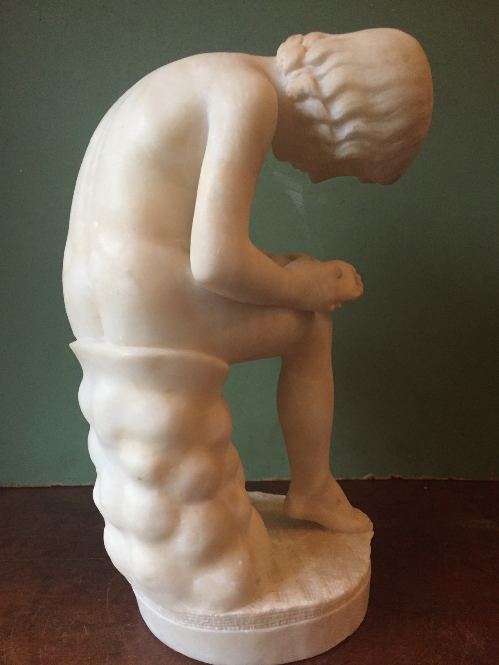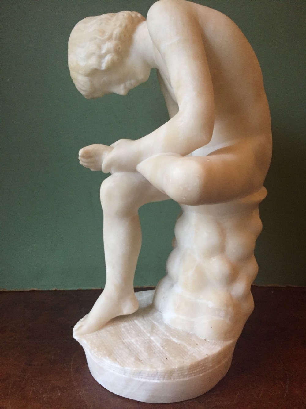 gut geschnitzte Alabaster-Reduktion von "lo spinario", der ikonischen antiken Statue des kleinen Jungen, der auf einem Felsen sitzt, der in tiefer Konzentration gezeigt wird, während er daran arbeitet, einen Dorn von der Fußsohle zu entfernen.