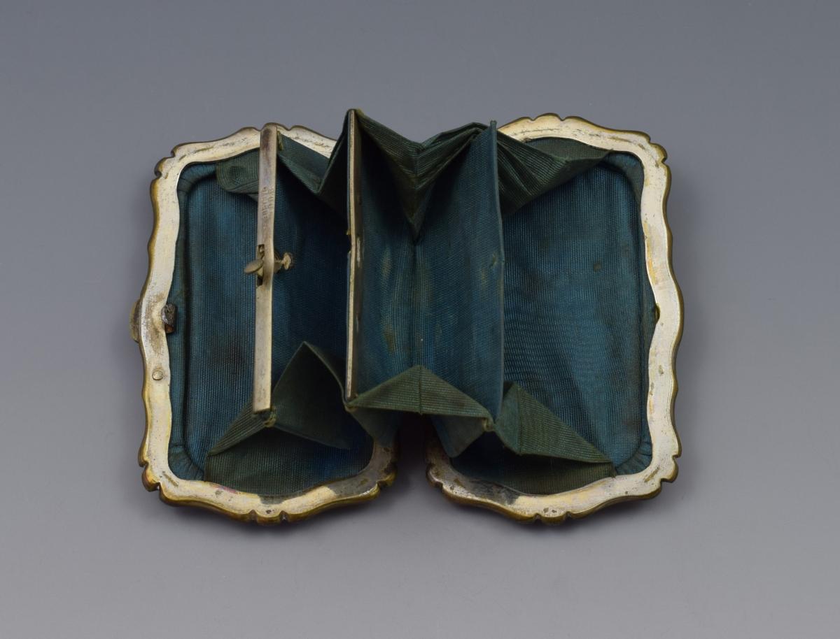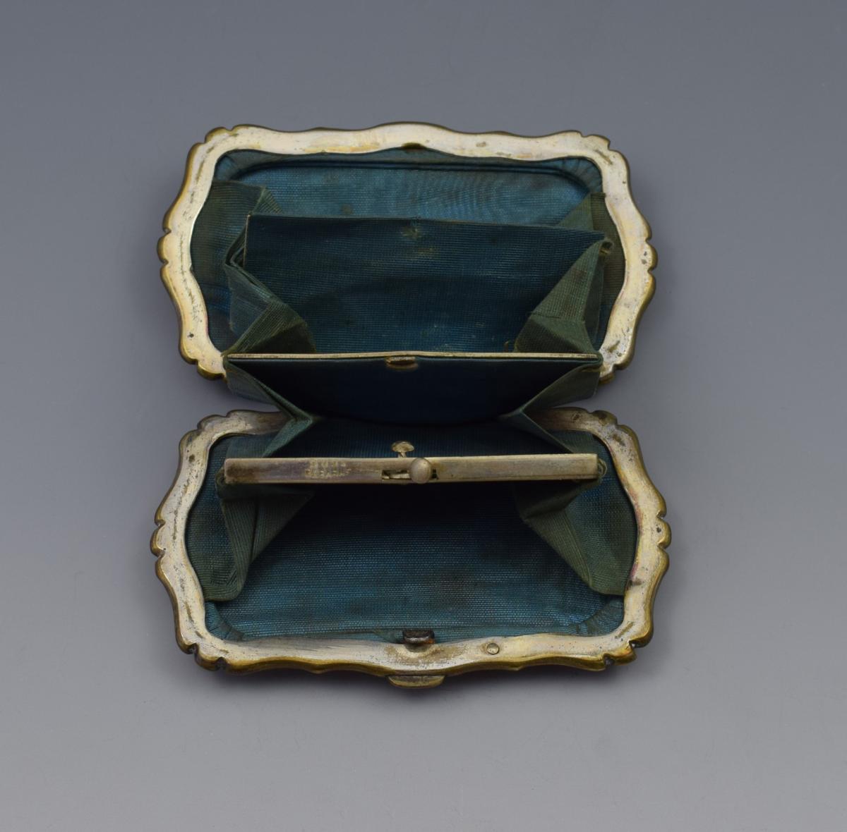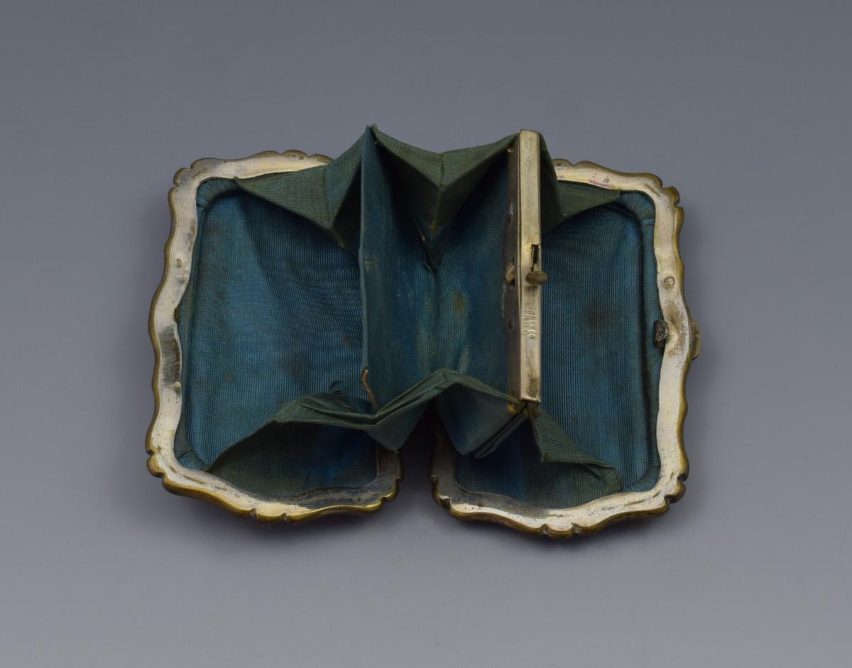 Zustand ist sehr gut; äußerlich keine Spuren oder Beschädigungen, obwohl das Metall ursprünglich versilbert war. innerhalb der Seide ein paar kleine Spuren, aber sonst alles intakt, keine Risse usw. Das kleine Schloss funktioniert.