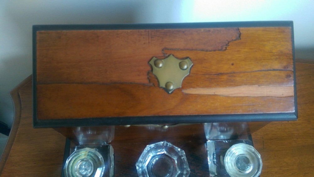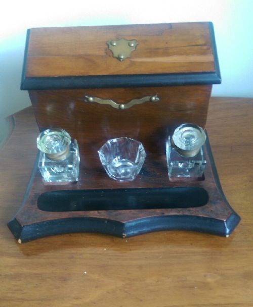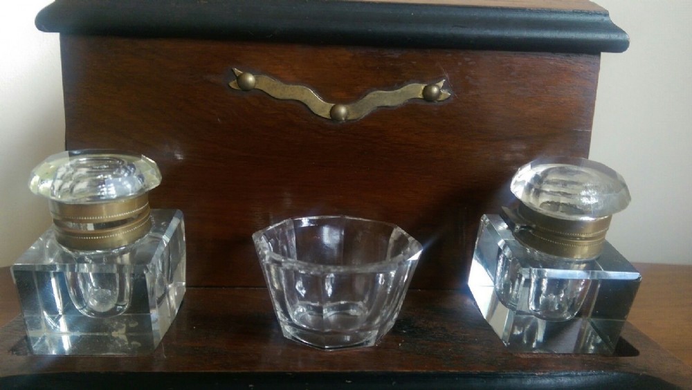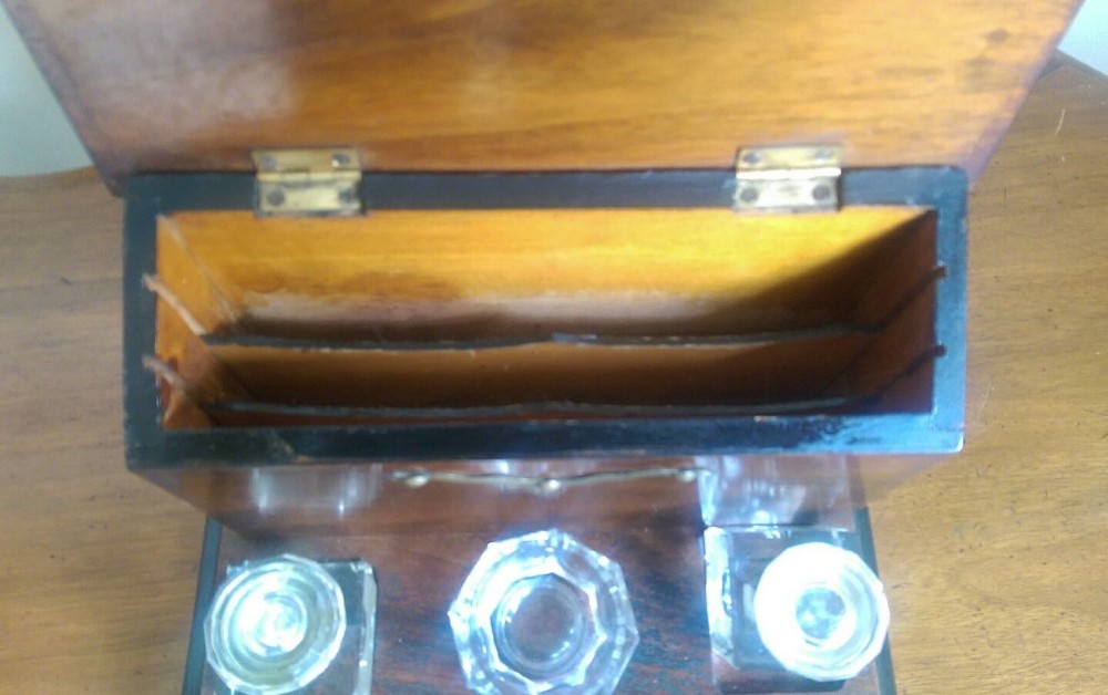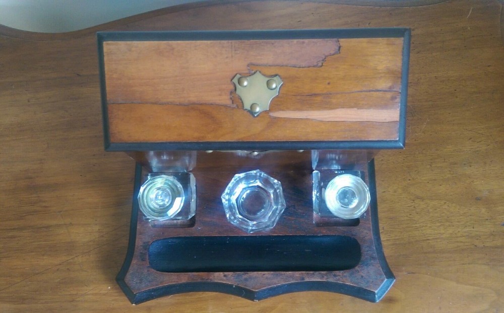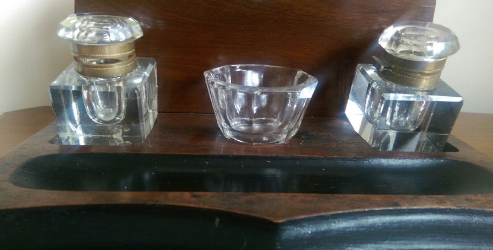 original englischer Tintenfass Ständer Massivholz Messing und Glas antike Rarität