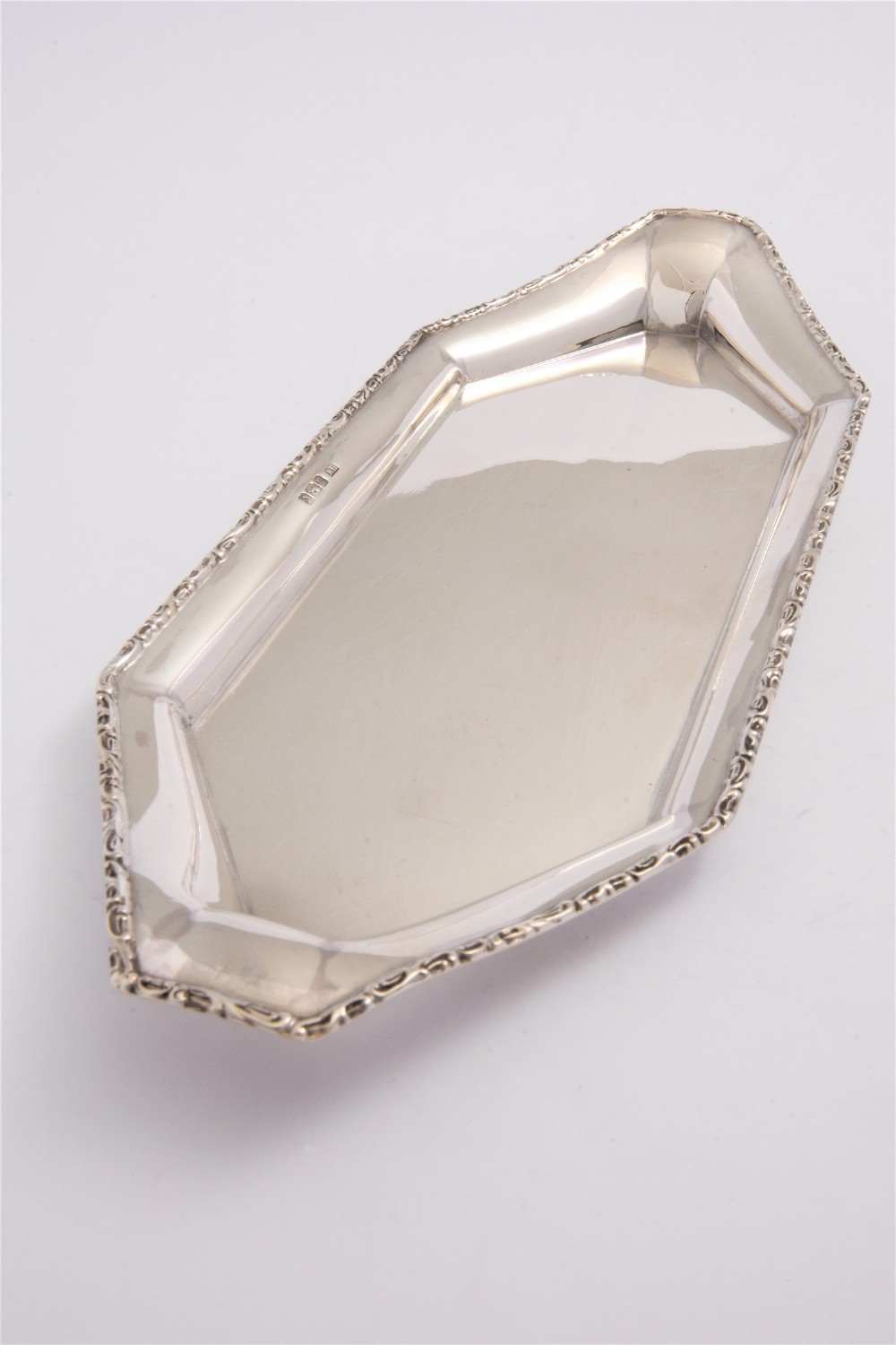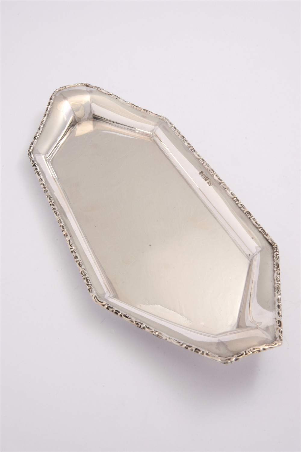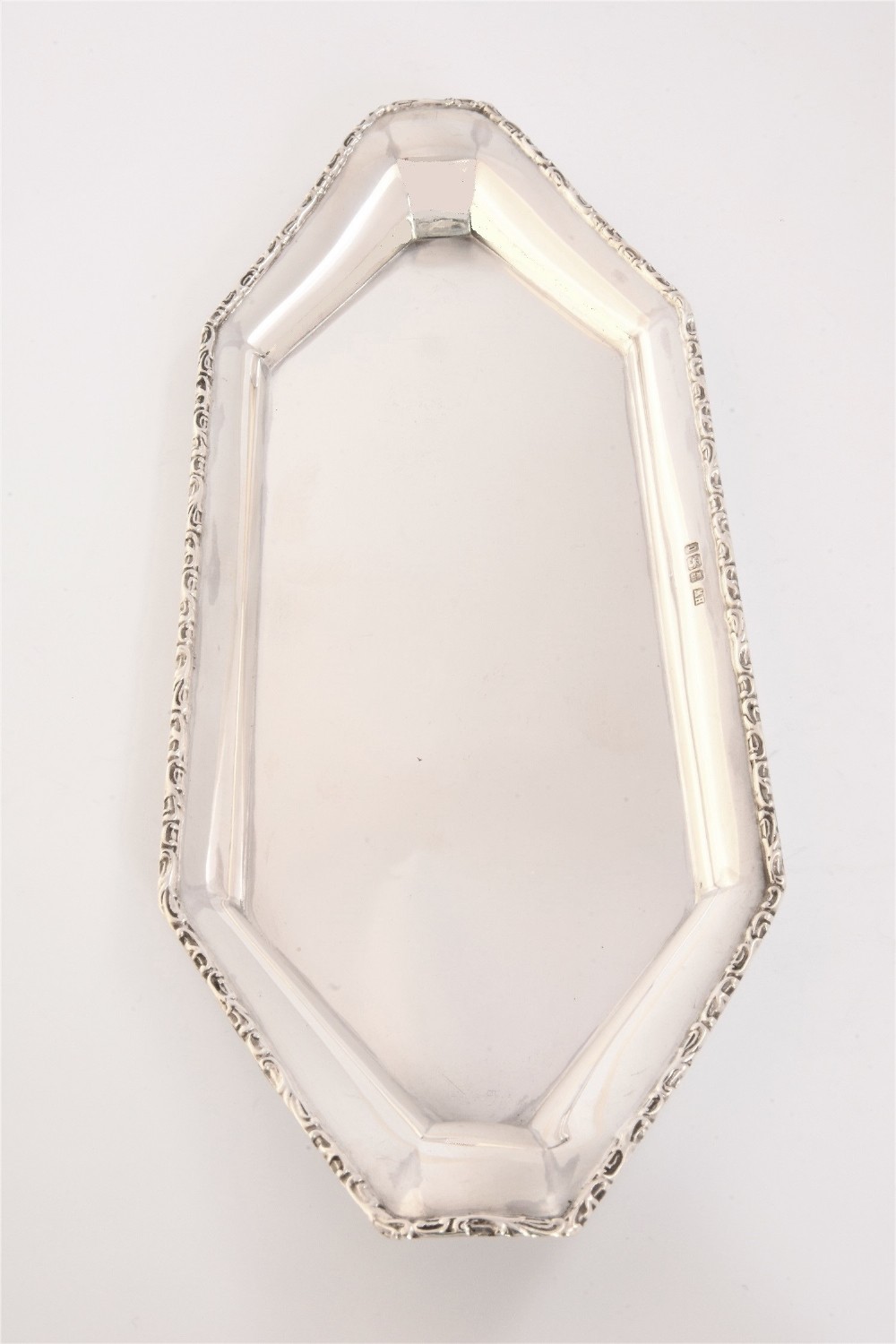 Die längliche achteckige Form bietet eine silberne Stiftablage auf einem flachen Sockel mit erhabenem Rand und aufgesetztem Dekor. Dieses schlichte silberne Tablett befindet sich in ausgezeichnetem Zustand und ist auf jedem Schreibtisch atemberaubend. Es ist schlicht und ohne Monogramme, Initialen oder zusätzliche Gravuren.