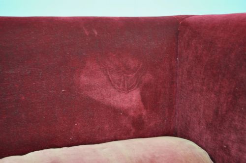 das sofa ist mit einem dunkelroten velourmaterial mit flechtdetail bezogen.