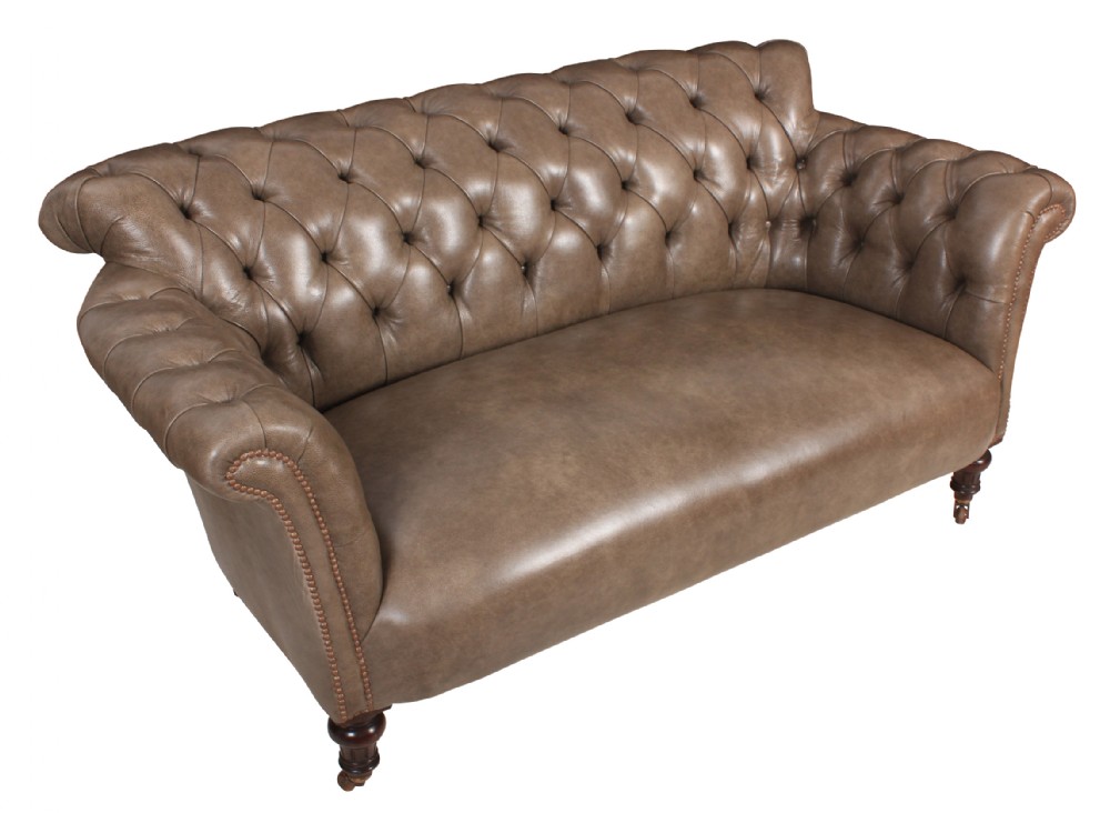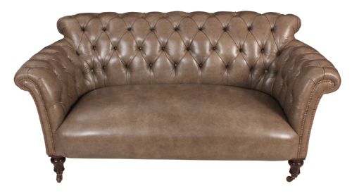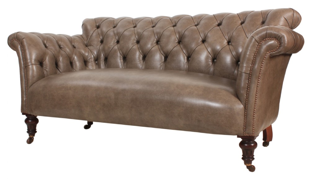 Auf schönen gedrechselten und geriffelten Beinen aus Mahagoni und mit einem hochwertigen mittelgrauen Leder mit geknöpftem Rücken und geknöpften Armen bezogen.
