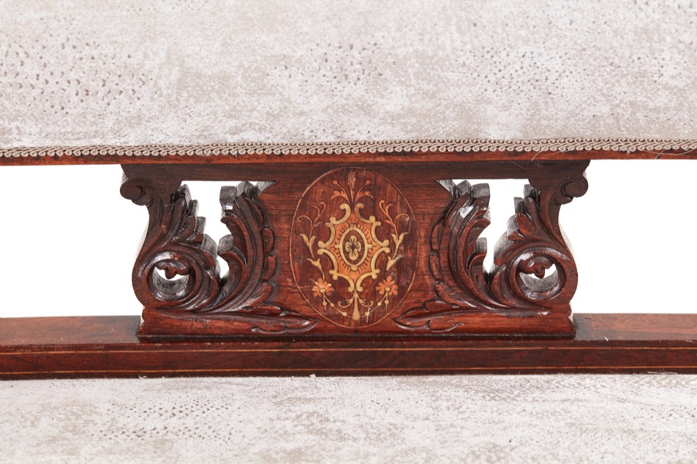 Edwardianisches Palisander Sofa mit feinen Buchsbaum Intarsien, schöne geschnitzte Platten auf der Rückseite, , gepolsterter Sitz, auf gedrechselten Beinen und Rollen