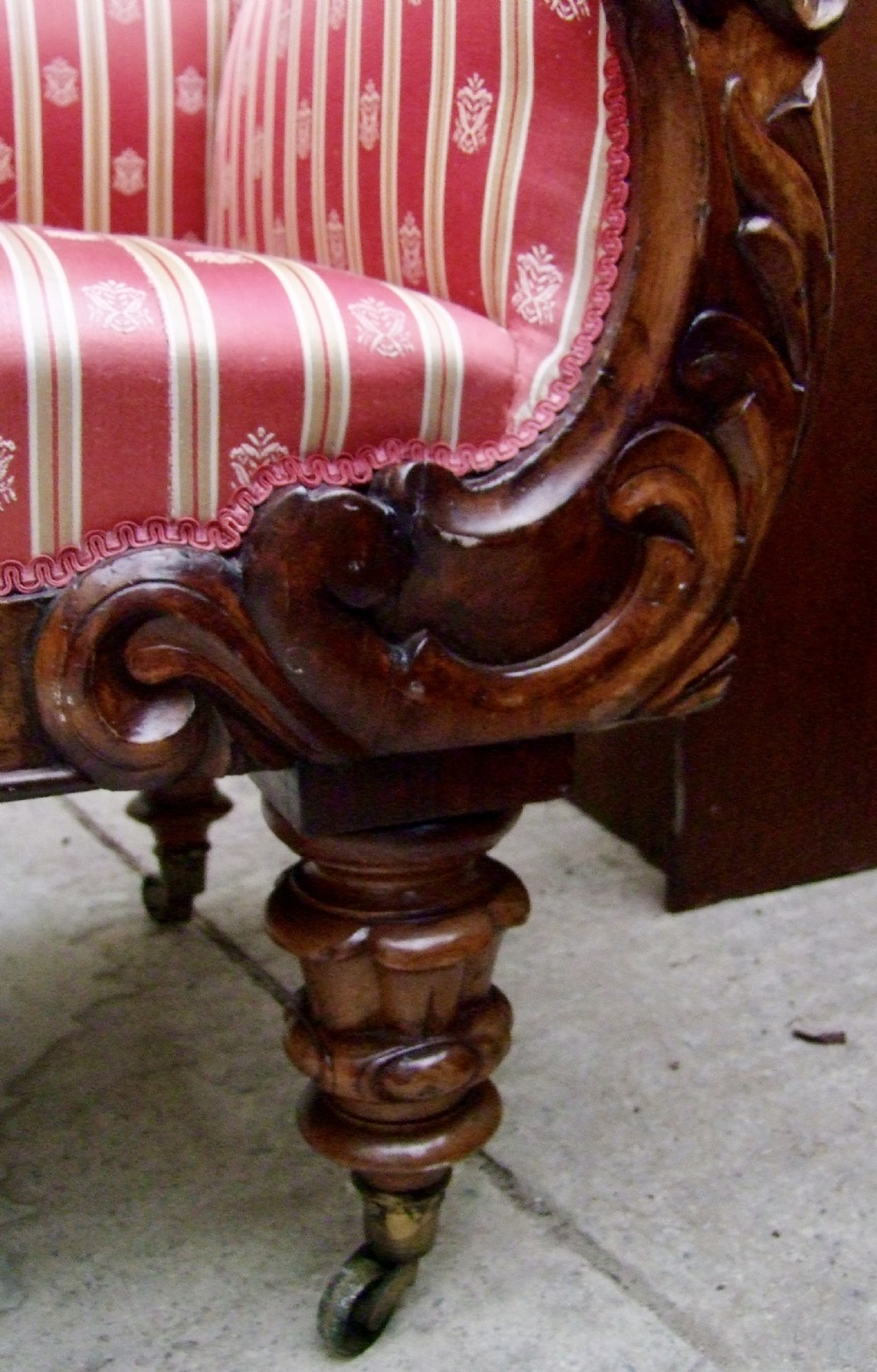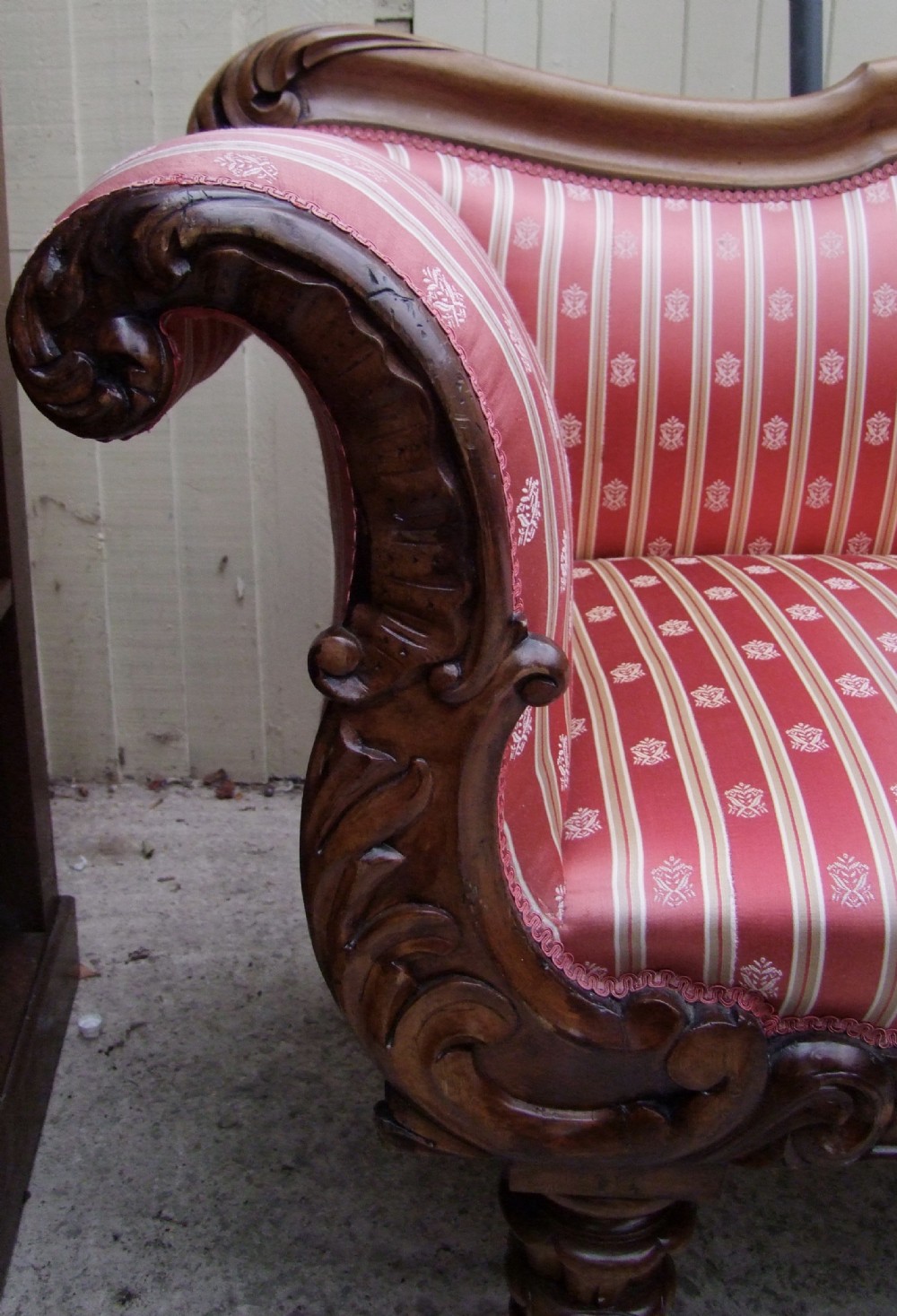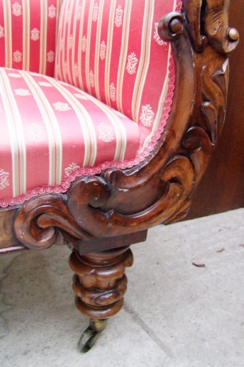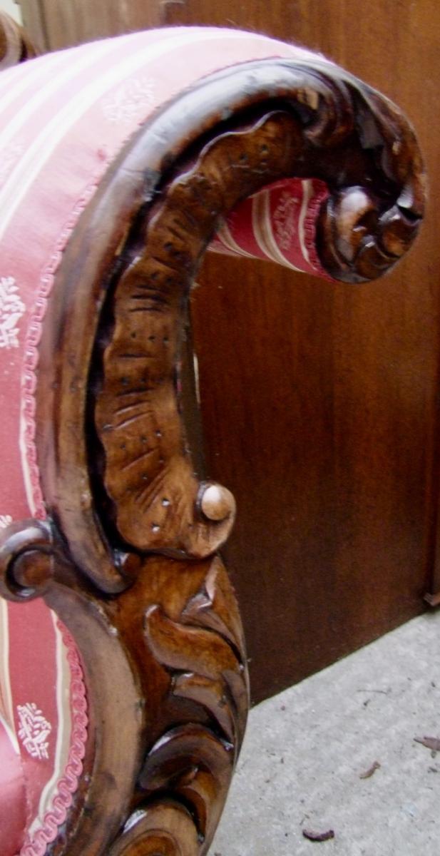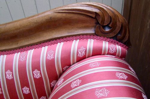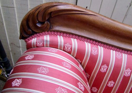 Original antikes Sofa mit geschwungener Form, schönen Schnitzereien und edlem Stoffbezug