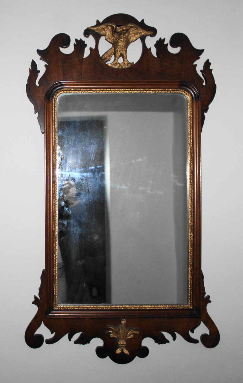 Der Spiegel hat eine vergoldete Adlerhalterung und einen vergoldeten Schlupf, der die Spiegelplatte umschließt