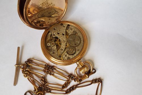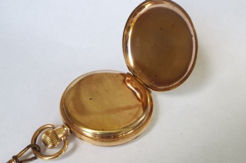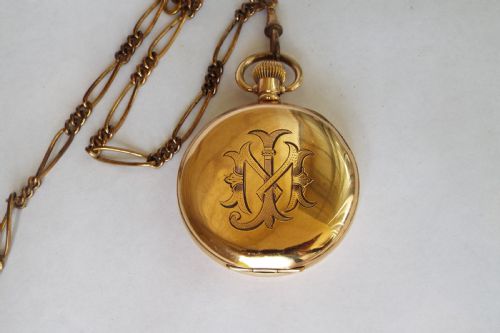 Die Uhr hat ein 15-Jewel-Werk, das gut funktioniert. Das Uhrwerk ist durch eine innere Scharnierabdeckung geschützt, die ein paar kleine Vertiefungen am Scharnier aufweist. Die Uhr misst 50mm Durchmesser ohne den Wickelstab und die Schlaufe. Das Gehäuse ist vergoldet und wurde von der Dennison Uhrenfirma hergestellt. Die Rückseite der Uhr hat die Initialen jm oder mj. Das Gehäuse ist in gutem Zustand, nur ein paar kleine Makel, aber nichts zu ernsthaft. Das Uhrenglas ist in einem guten Zustand. Das weiße Zifferblatt hat einige Haarrisse, die aber mit bloßem Auge schwer zu erkennen sind. gebläute Stahlzeiger, ein Sekundenzeiger und eine äußere Minutenanzeige. Die Uhr wird mit einer Double Albert Kette geliefert, wobei jede Kette 21 cm lang ist, einschließlich des Bügels und der Schließe. Bei einer Double-Albert Taschenuhrkette lässt sich zusätzlich etwas am zweiten Kettenende befestigen, z.B. der Schlüsselbund. Die Uhr und die Kette werden in einer neuen Präsentationsbox verschickt.