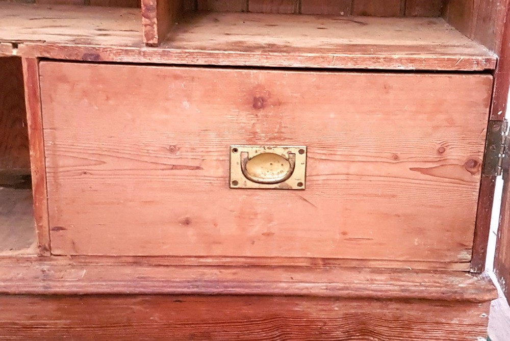 perfect for all your storage needs. 4 full length shelves running through the upper half, with 6 pigeon hole style sections below. there is also a drawer to the bottom right hand side. the piece sits on its own plinth. working key included.