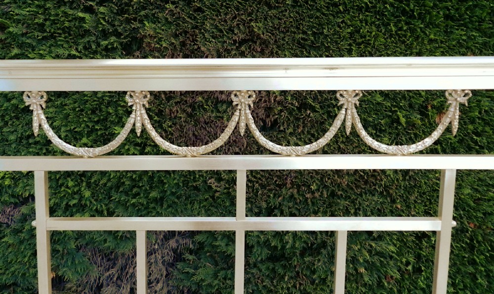 Das Bett steht auf seinen originalen Keramikrollen. Der Rahmen wird für den Versand zerlegt.