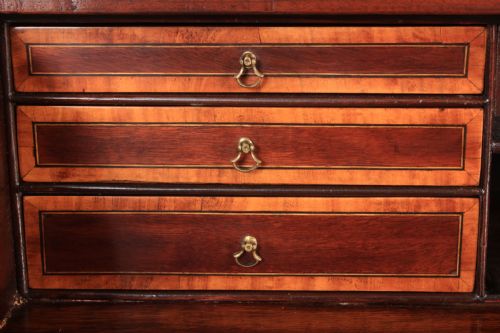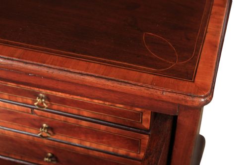 Die Schubladenfronten sind von guter Bauqualität, mit intarsierten Fronten und Messinggriffen.