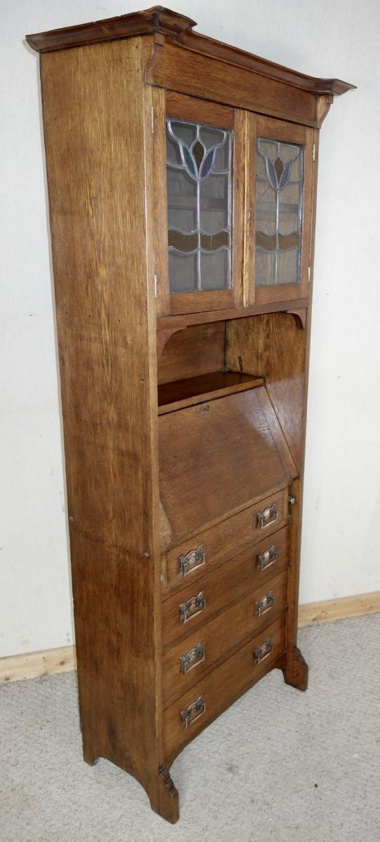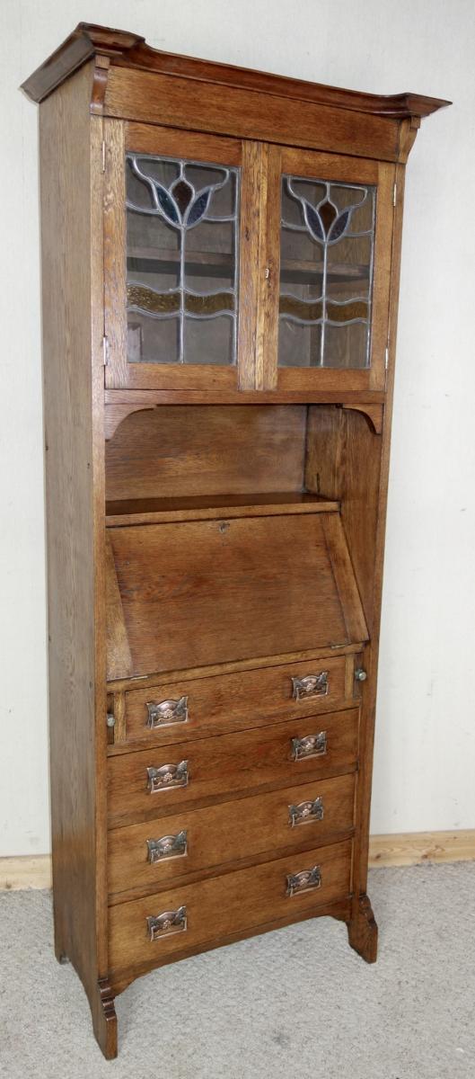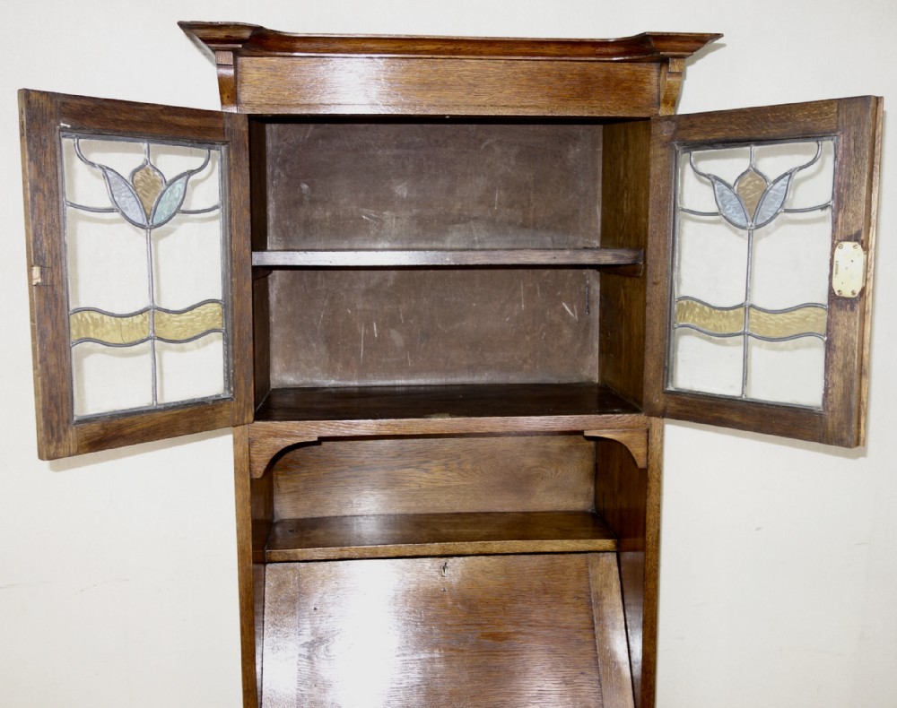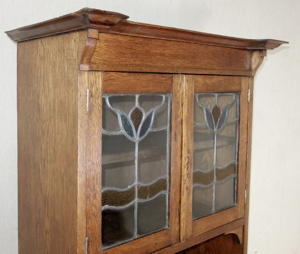 Schmaler Bücherschrank, farbiges Glas , aus massiver Eiche Arts & Crafts 1920