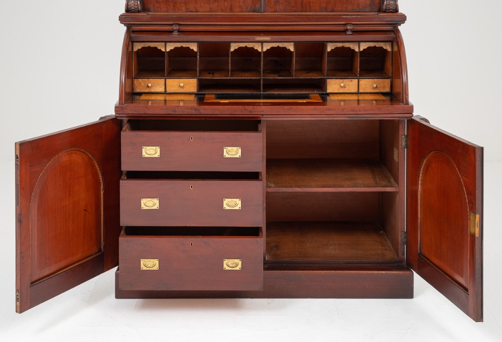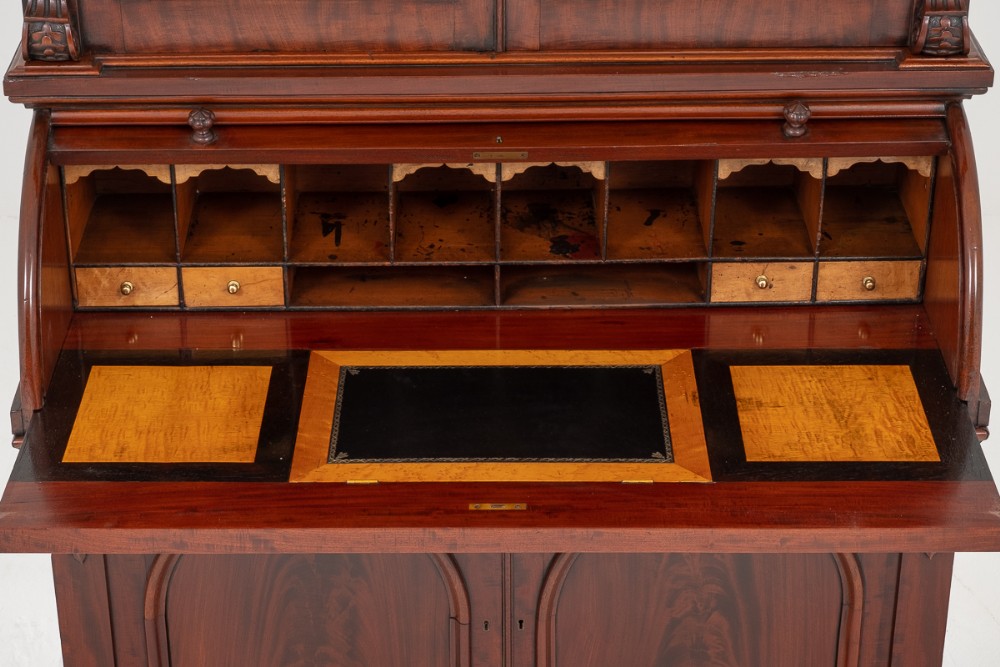 Mit einem Zylinder Sekretär mit schönem Innenraum, welcher mit Schubladen und Fächern ausgestattet ist.