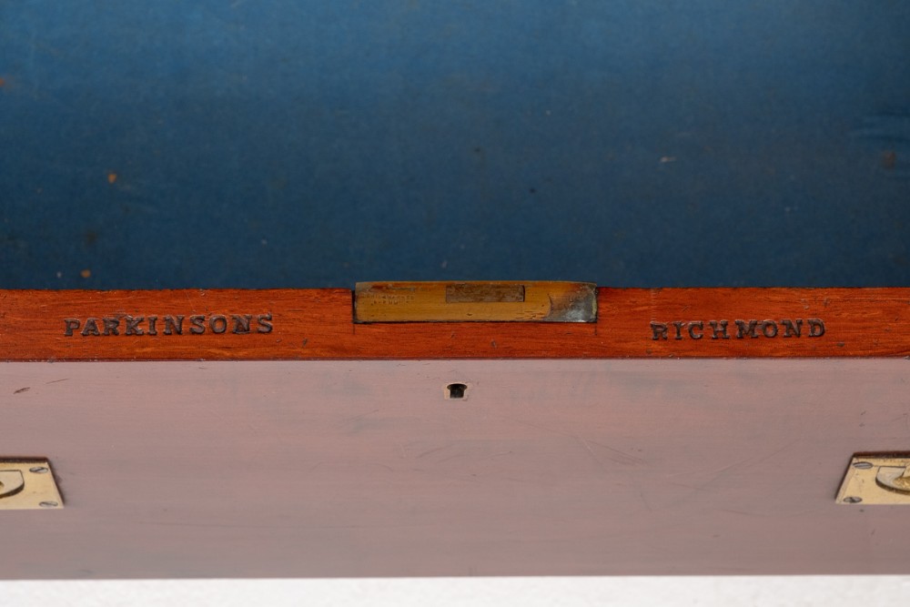 Die Türen öffnen sich, um 3 x Schubladen und Regale zu enthüllen. (Beachten Sie die Briefmarken Parkinsons von Richmond London)