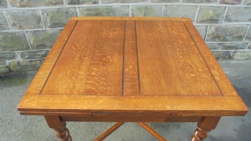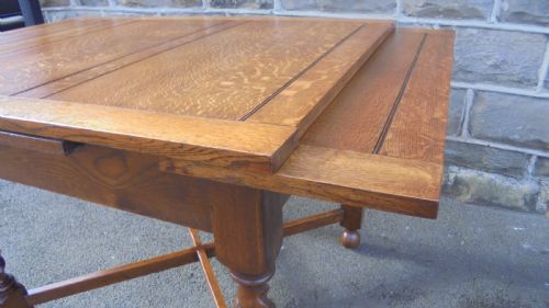 Er hat eine mittlere Eichenfarbe mit reizender Maserung. Der Tisch bietet Platz für 6-8 Personen, wenn er vollständig ausgefahren ist.