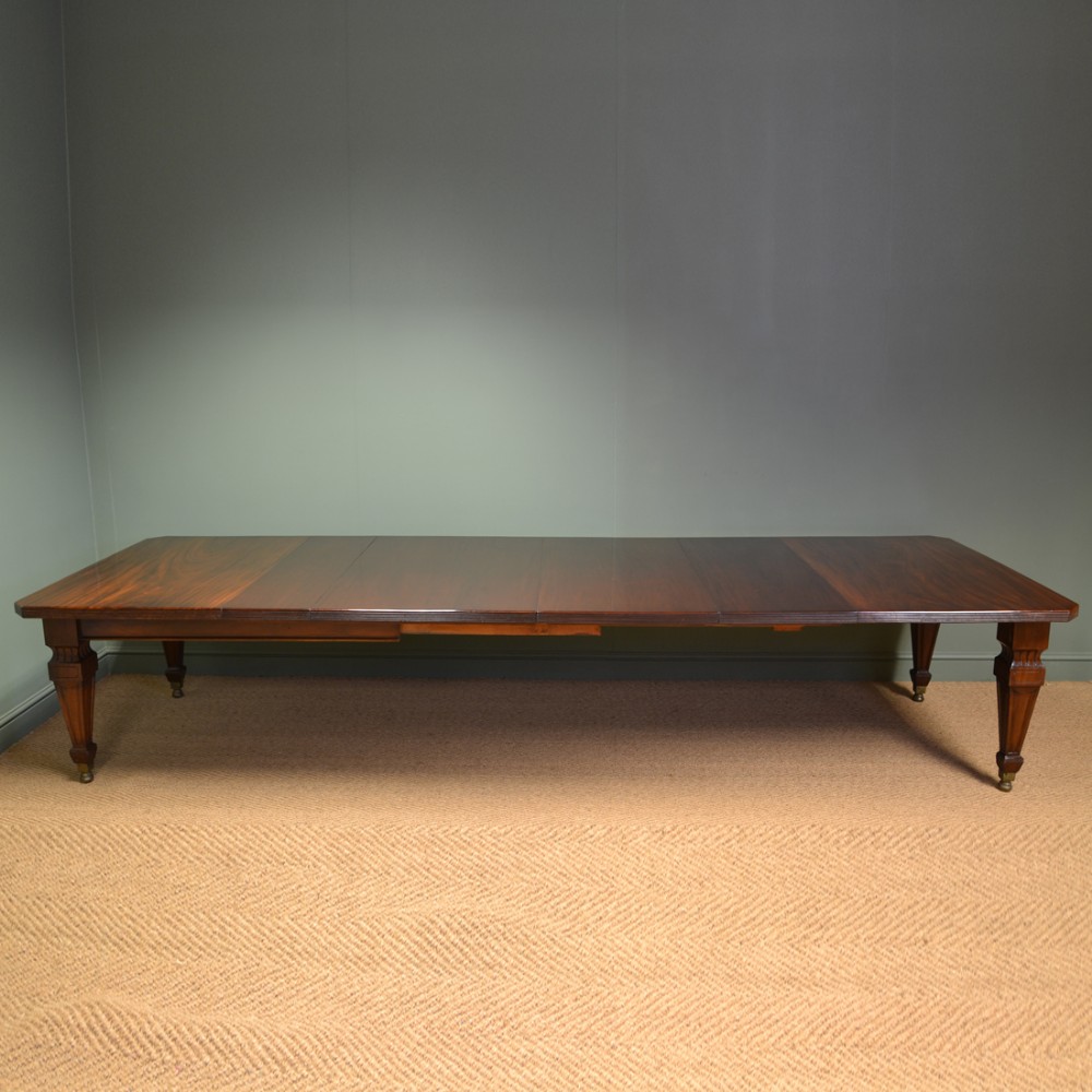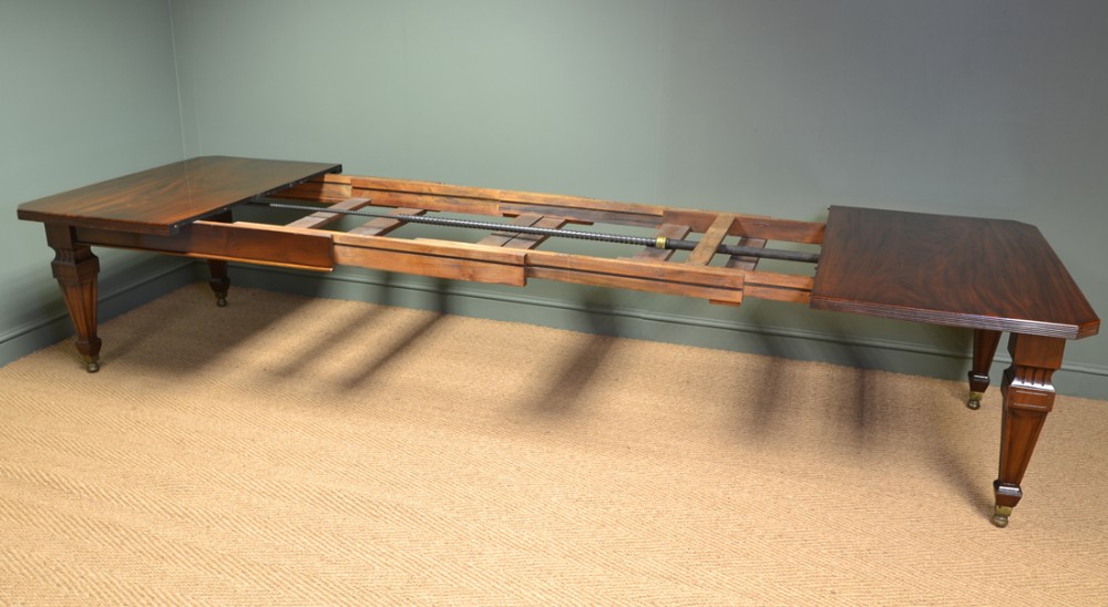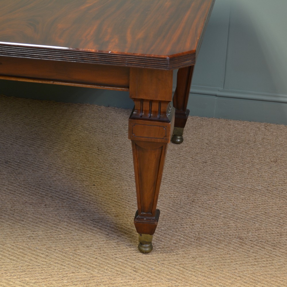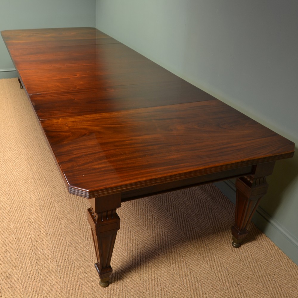 Der erstaunlich lange Esstisch hat einen Aufzugsmechanismus und vier abnehmbaren Bretter. Dank der abnehmbaren Bretter kann dieser Super-Tisch auf verschiedene Größen erweitert werden und bietet Platz für bis zu vierzehn Dinner-Gäste. Dieser riesige Tisch ist voller Charme und Charakter und steht auf geformten, konischen Beinen mit Messingbeschlägen. das Mahagoni ist zu einem satten Farbton mit einer auffälligen Maserung gealtert, hat eine gute Patina, ist in einem sehr guten Zustand und wurde mit einer traditionellen Form der Wachsbearbeitung schön gereinigt.