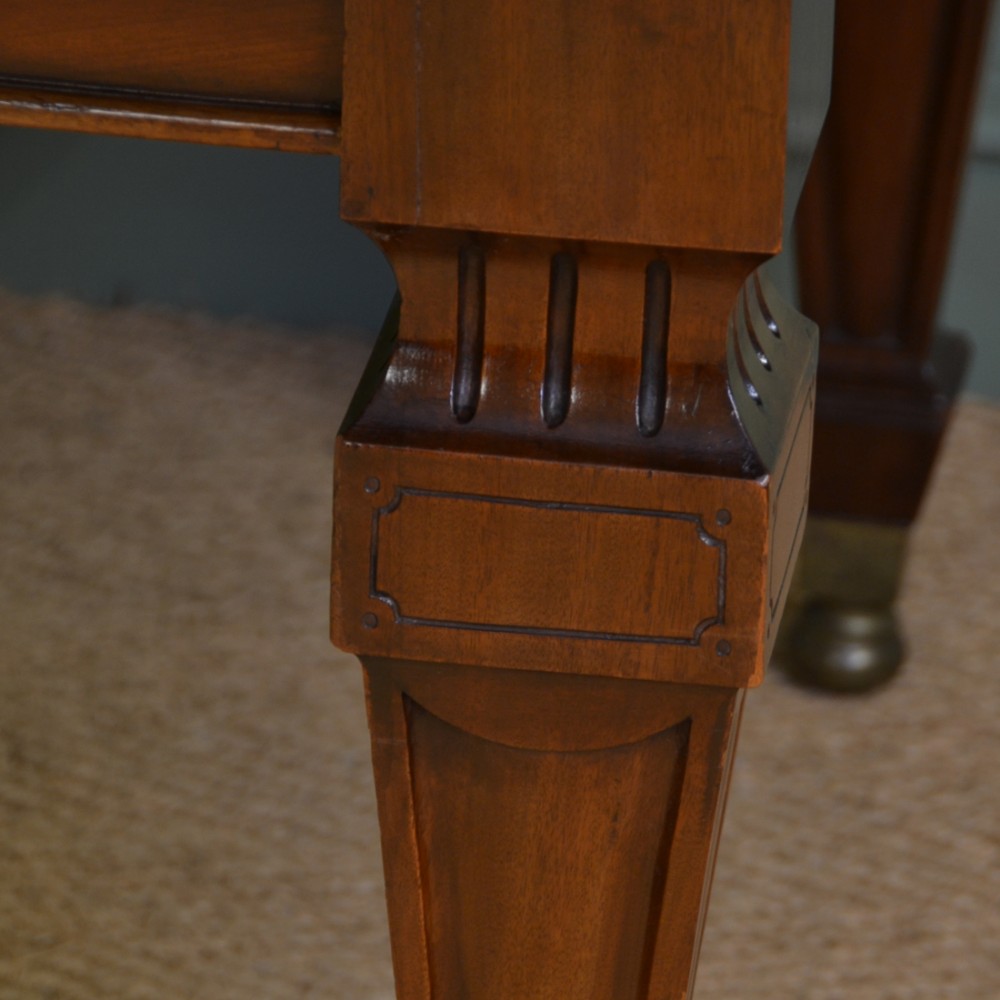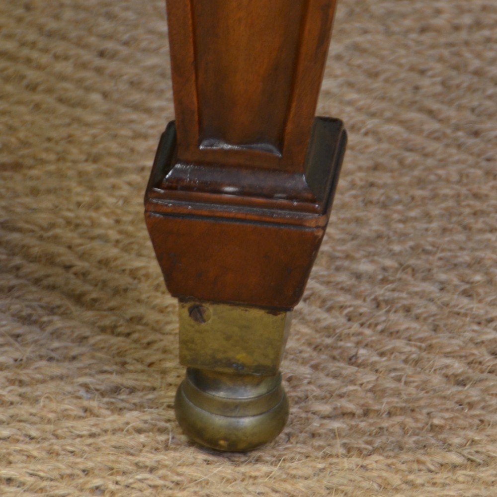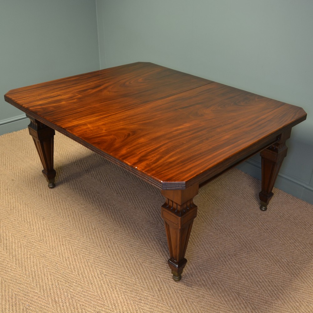 Der erstaunlich lange Esstisch hat einen Aufzugsmechanismus und vier abnehmbaren Bretter. Dank der abnehmbaren Bretter kann dieser Super-Tisch auf verschiedene Größen erweitert werden und bietet Platz für bis zu vierzehn Dinner-Gäste. Dieser riesige Tisch ist voller Charme und Charakter und steht auf geformten, konischen Beinen mit Messingbeschlägen. das Mahagoni ist zu einem satten Farbton mit einer auffälligen Maserung gealtert, hat eine gute Patina, ist in einem sehr guten Zustand und wurde mit einer traditionellen Form der Wachsbearbeitung schön gereinigt.