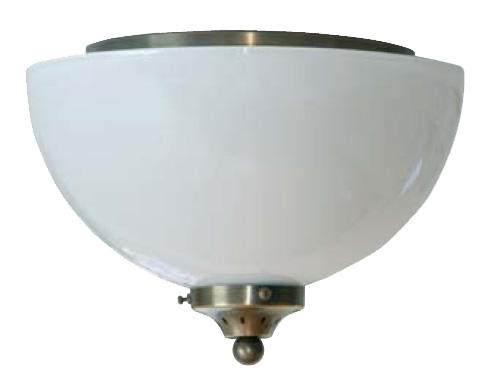 Die Bauhausstil Deckenleuchte hat eine Messingarmatur mit antikpatiniertem Opalglas. Die Leuchte ist für Flur und niedrige Decken geeignet.