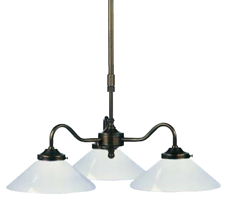 Die Jugendstil Deckenleuchte mit runden Armen und verstellbarem Schiebegestänge ist für runde Esstische geeignet. Die handgefertigte Hängeleuchte ist 3-armig und hat offene Opalgläser.