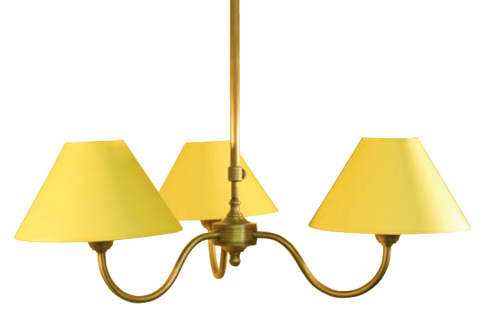 Die moderne Deckenleuchte mit runden Armen ist für runde Esstische geeignet. Die handgefertigte Hängeleuchte ist 3-armig mit ausgefallenen gelben Lampenschirmen.