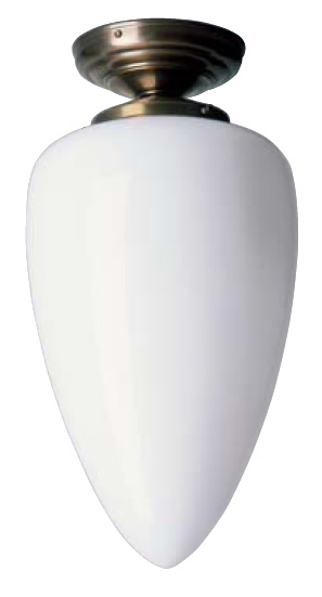Die schöne klassische Bauhausleuchte mit Messingbaldachin hat ein großes ausgefallenes, zapfenförmiges Opalüberfangglas. Die Leuchte ist für Gastronomie und Hotelerie sowie für Flure und Dielen geeignet.