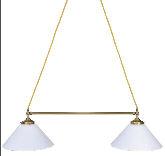 Die Landhaus Balkendeckenleuchte mit goldfarbener Textilzuleitung und 2 Opal-Schusterschirme ist für Esstische geeignet. Die Messing Hängelampe ist edel und elegant