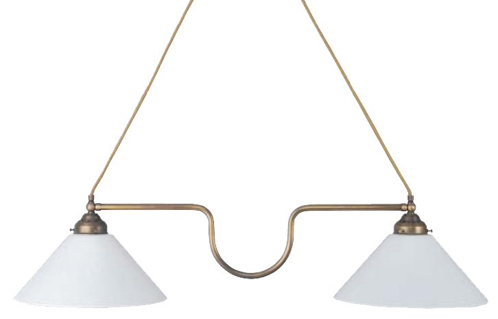 Die Landhaus Balkendeckenleuchte mit gebogenem Mittelteil und goldfarbener Textilzuleitung ist für den Esstischbereich geeignet. Die Hängeleuchte hat 13er antik patiniertes Messingrohr und Opalschusterschirme.