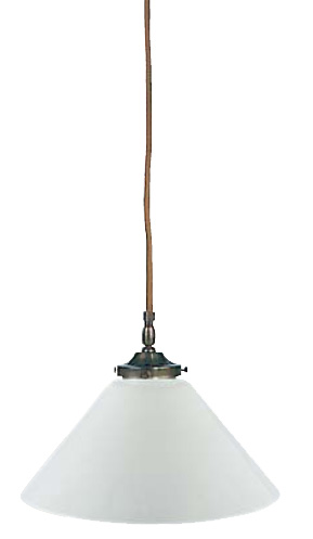 Die Landhaus-Pendelleuchte hat ein goldfarbenes Textilkabel und eine flache gelochte Messingglashalterung mit 3 Rändelschrauben zum Fixieren des Glases. Die Lampe ist für kleine, runde Tische geeignet.