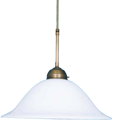 Die Landhaus-Pendelleuchte hat ein goldfarbenes Textilkabel und eine höhere gelochte Glashaltekappe mit 3 Rändelschrauben zum Fixieren des Glases. Der weiße Schusterschirm besteht aus 3-Schichtenopalglas.
