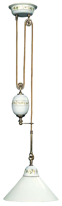 Die nostalgische Keramik-Gegenzugpendelleuchte hat goldenes Textilkabel, weißes Gegengewicht und Umlenkrollen. Die Lampe ist grün gemustert.