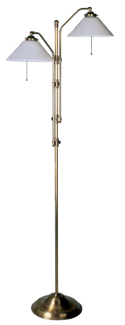 Die schöne Landhausstil Stehleuchte mit zwei verstellbaren eckigen Armen hat eine Zugkettchenfassung, ein Flügelkippgelenk und eine massive Führungsstange. Die Schusterschirme aus Opalglas sind weiß.
