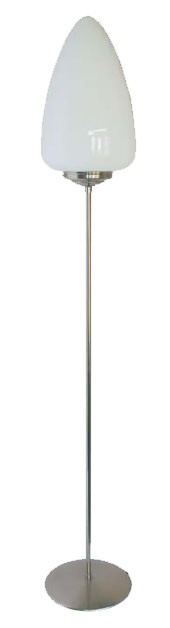 Die moderne ausgefallene vernickelte Stehleuchte im Bauhausstil hat einen flachen Sockel, einen Trittschalter und ein modernes großes, zapfenförmiges Opalglas.