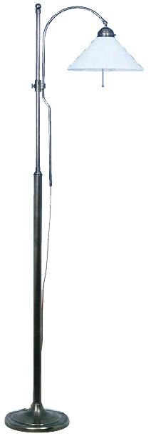 Die Landhausstil Stehleuchte mit verstellbarem rundem Arm ist als Leseleuchte nutzbar. Die Lampe hat am Opalschusterschirm eine Zugkettchenfassung. Das Unterteil der Lampe ist aus 35 mm starkem kanneliertem Messingrohr gebaut.