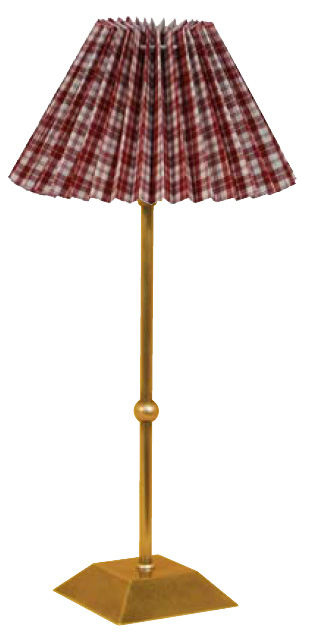 Die kleine Beistellleuchte hat einen karierten Textilschirm.