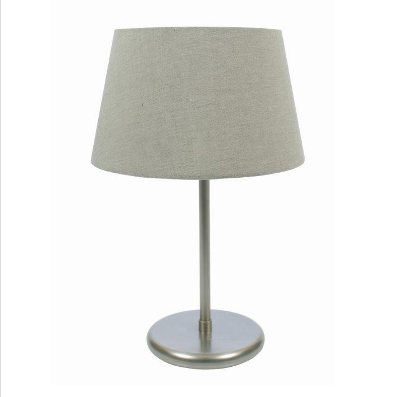 Die kleine Landhaus Beistellleuchte ist matt vernickelt, hat einen abgerundeten Messingsockel und dunkelbeigen, runden Textilschirm.