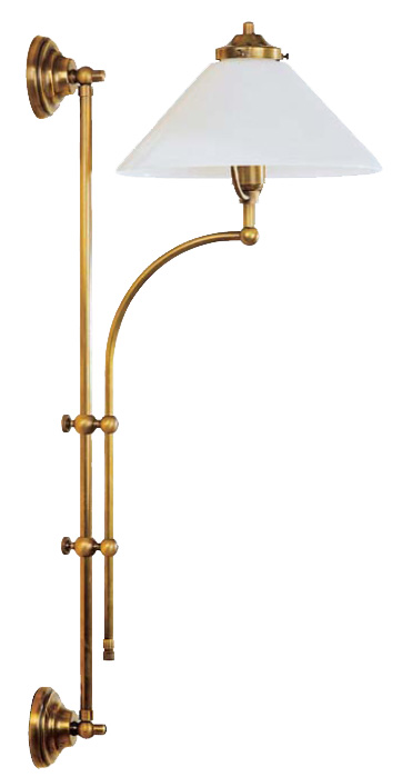 Die Wandleuchte mit Verbindungsstange hat einen gebogenen Arm und ein Kippgelenk. Die Lampe ist antik patiniert und verstellbar.