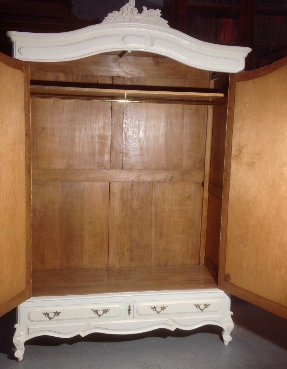 Die beiden Türen öffnen sich zu einem geräumigen Stauraum, es gibt ein oberes Regal und eine neu montierte Messingschiene.