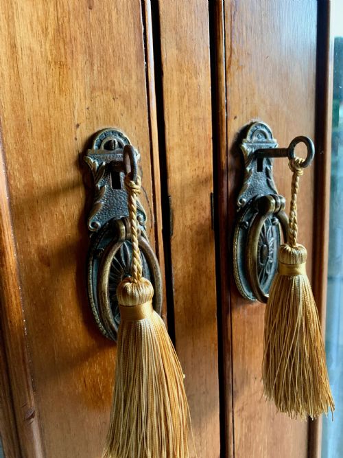 Die Garderobe hat leichte altersbedingte Abnutzungenn, die Türen öffnen und schließen sich reibungslos, es gibt keine Anzeichen von Holzwürmern, die drei auf den Fotos gezeigten Schlüssel sind nicht funktionsfähig und rein dekorativ, die Garderobe teilt sich für den Transport in drei Abschnitte auf.