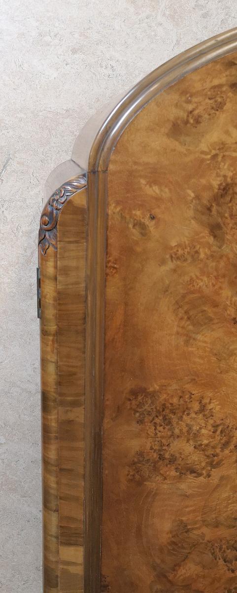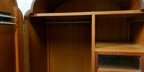 Die Garderobe ist mit zwei gewölbten Türen aus Nussbaumholz mit geformten Kanten, originalen Griffen und Blumendekor an den Ober- und Seitenwänden ausgestattet