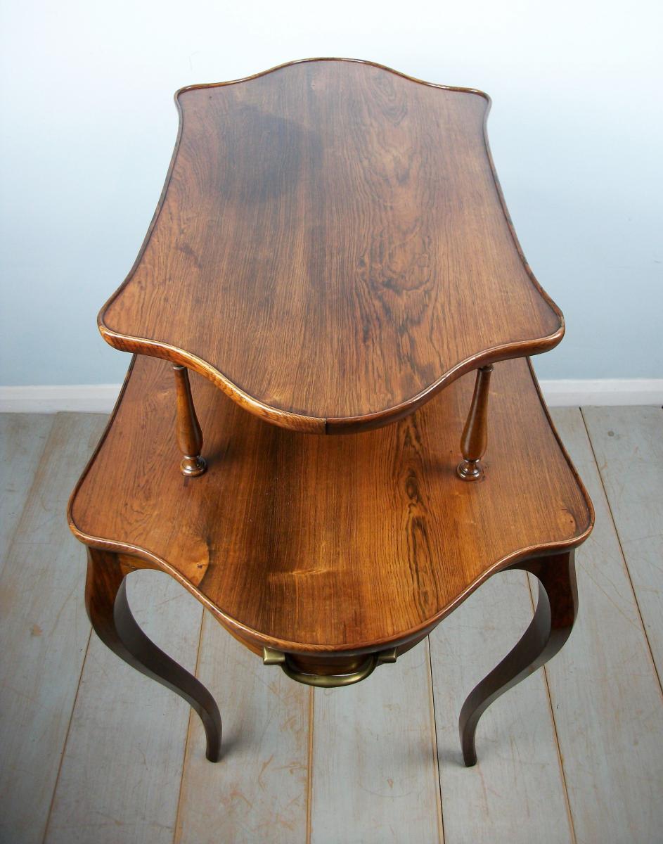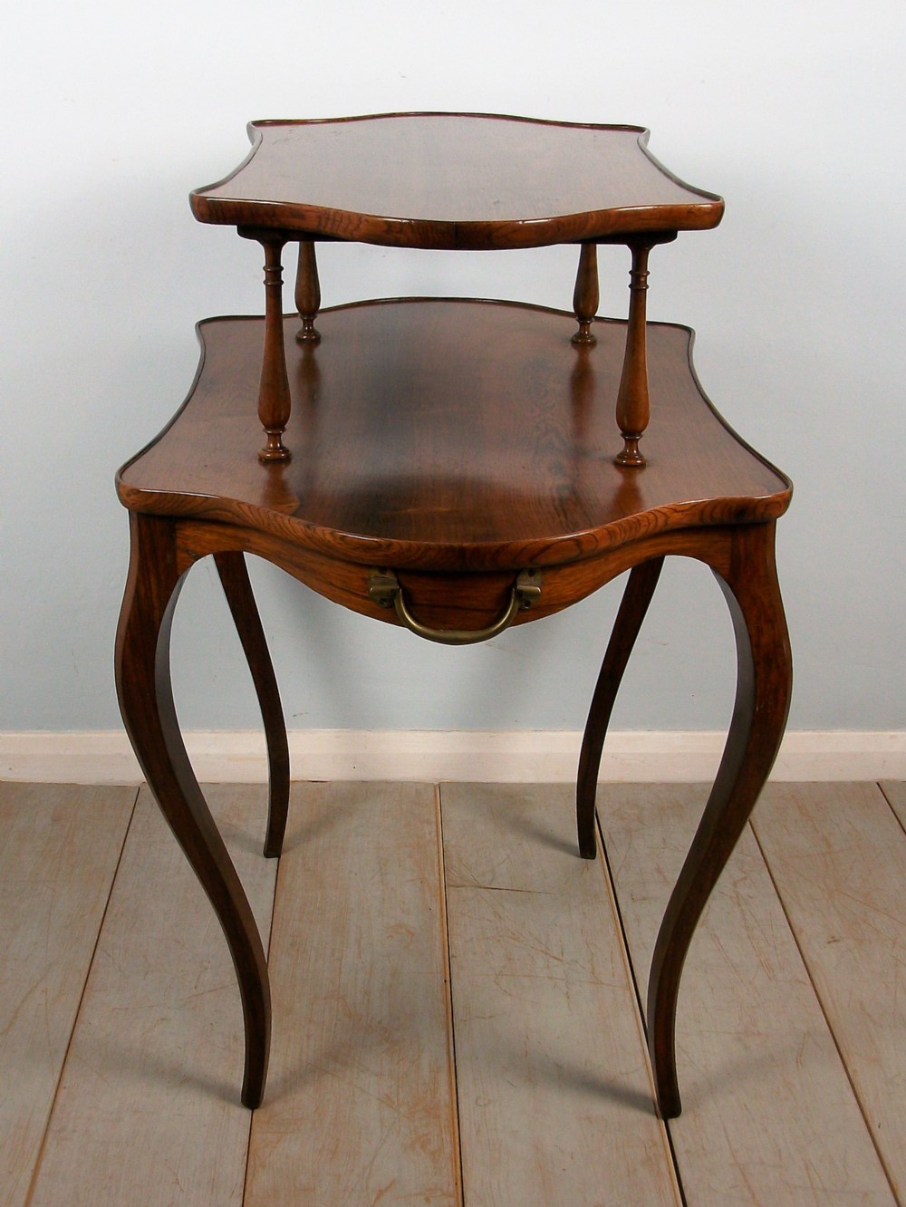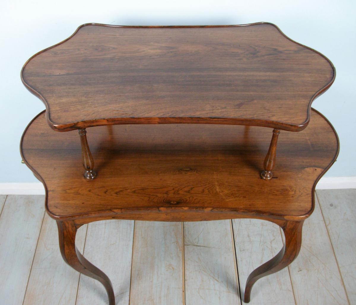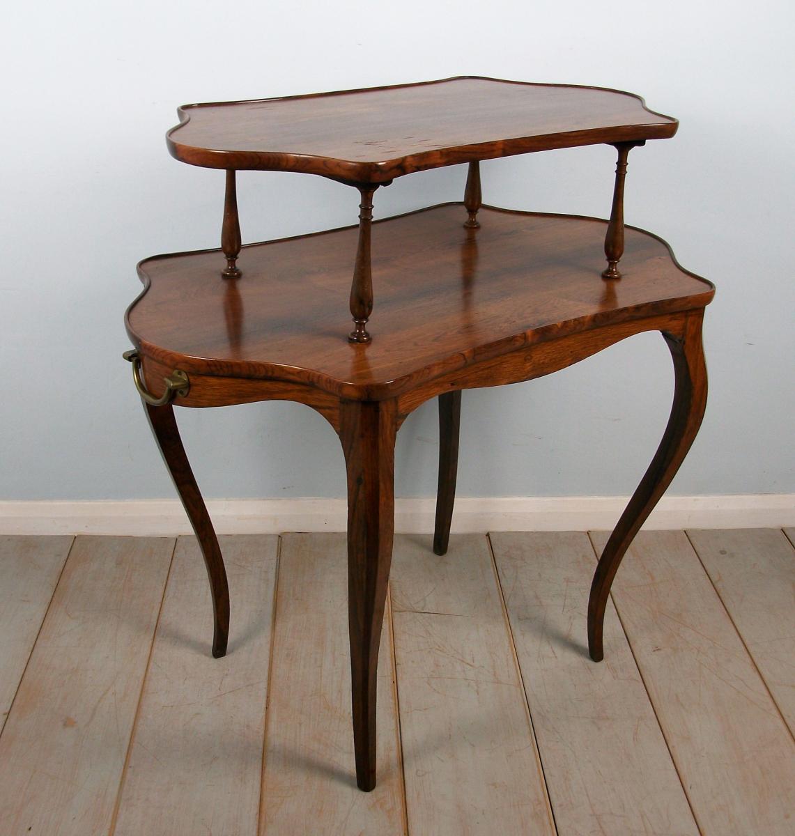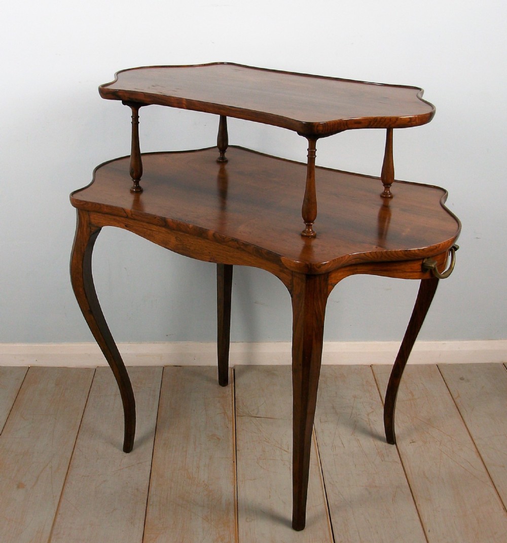 Die beiden ungewöhnlich geformten Etagen, wahrscheinlich in einem Palisanderfurnier, sind durch vier elegant gedrehte Stützen voneinander getrennt.