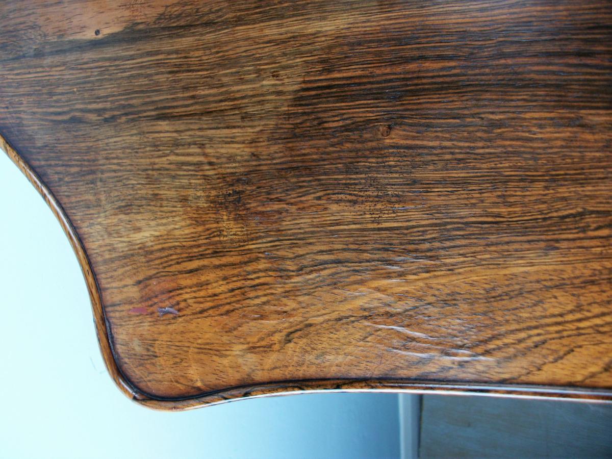 Die leichten Unvollkommenheiten des Furniers auf der obersten Etage (siehe Fotoausschnitt) beeinträchtigen die Schönheit dieses eleganten und nützlichen Tisches nicht (siehe Foto).