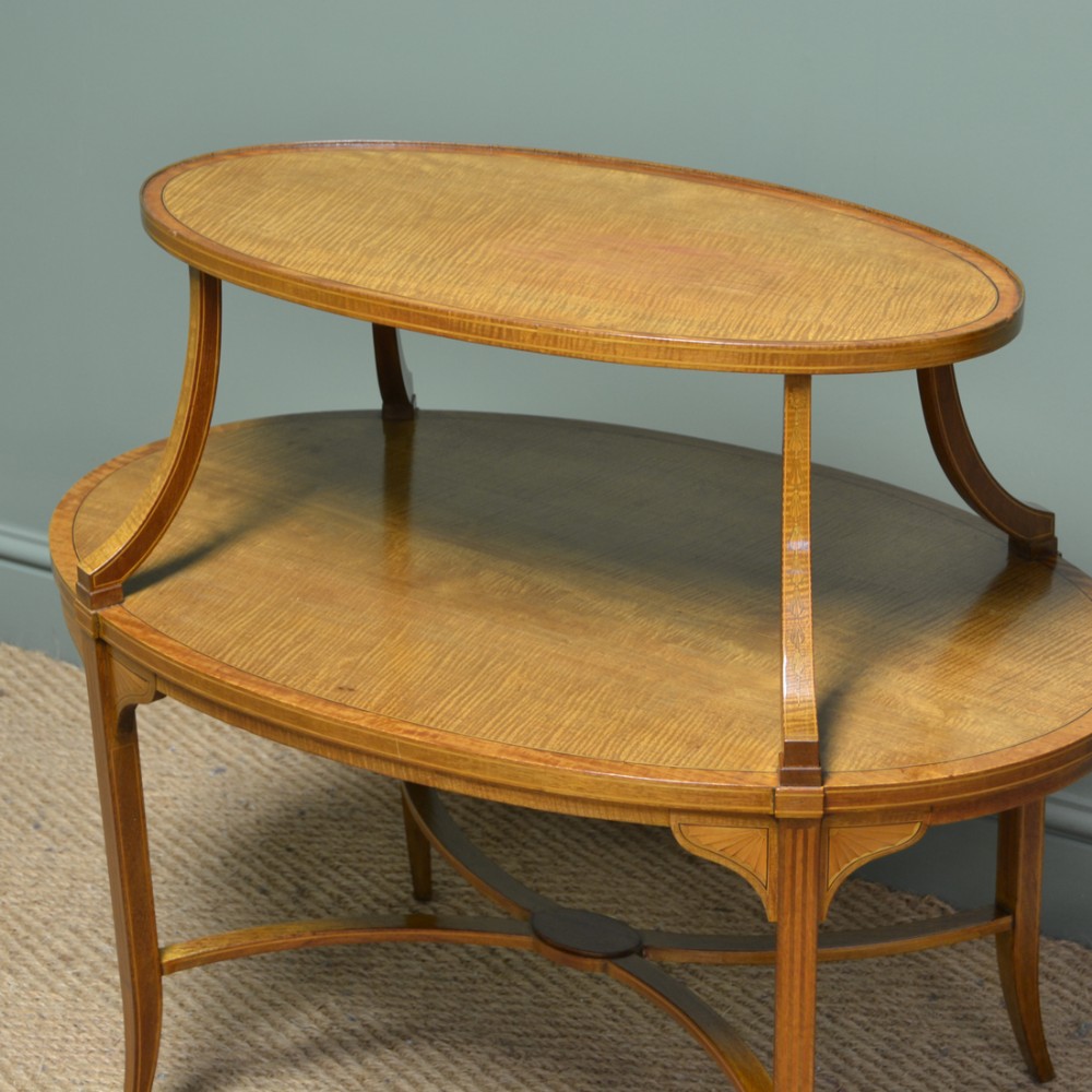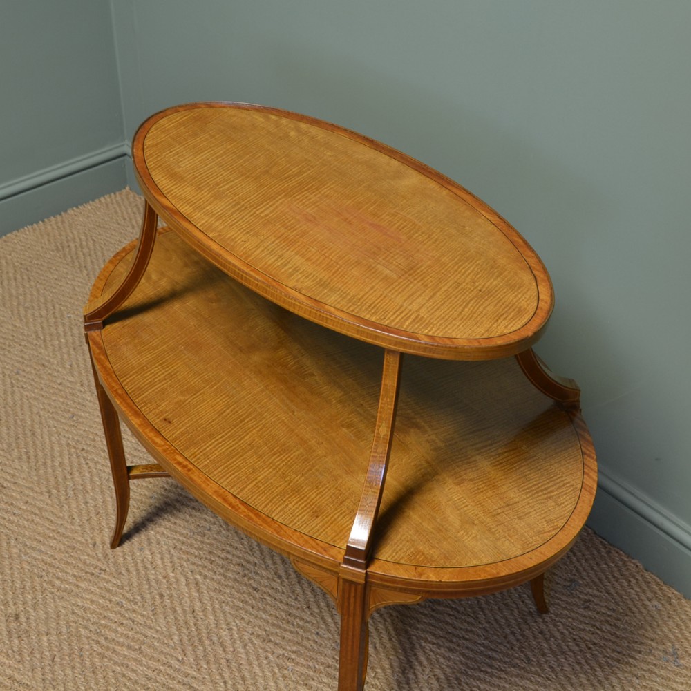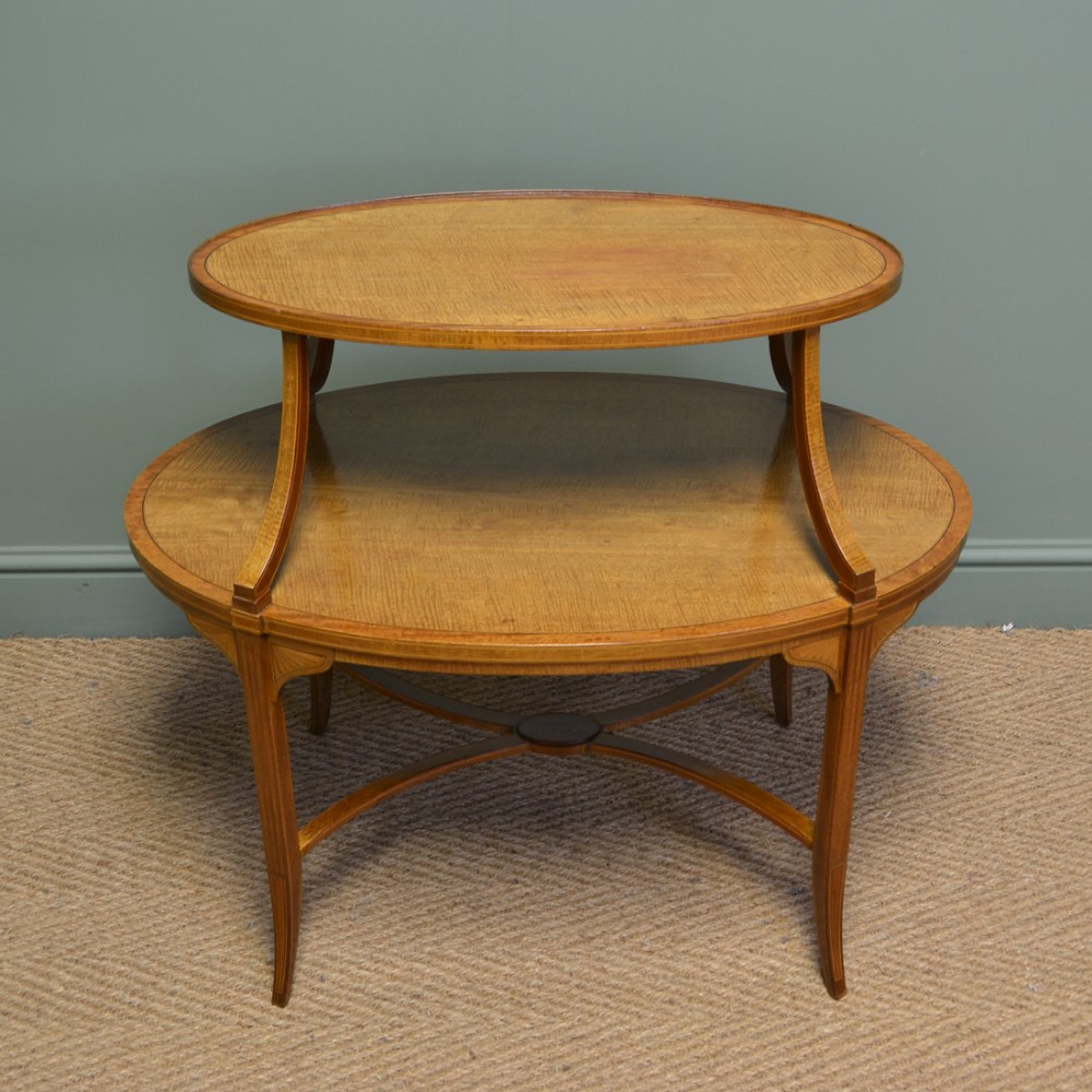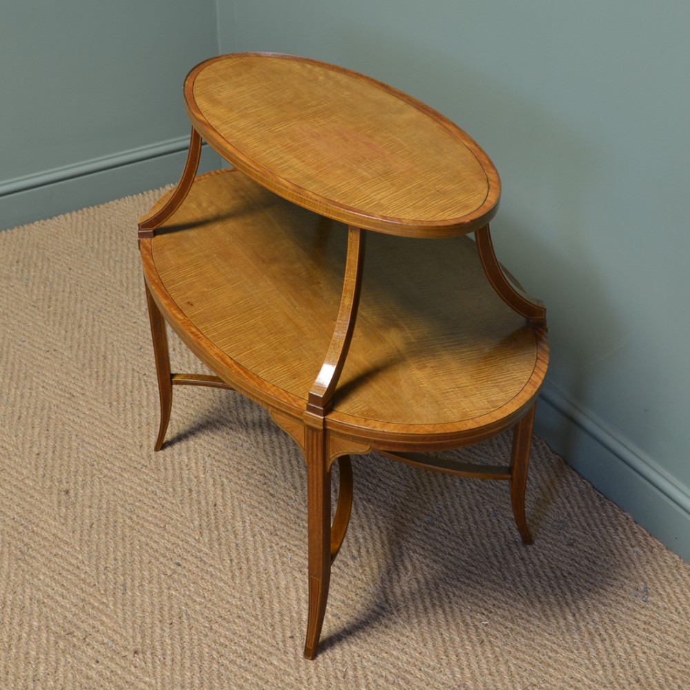 Dieser hervorragende Tisch wurde von den renommierten Machern Edwards & Roberts gebaut und besticht durch zwei ovale Ebenen, Buchsbaum- und Ebenholz-Intarsien und feine gespreizte Beine. Das Satinholz ist zu einem satten Goldton mit auffälliger Maserung und guter Patina gealtert, in sehr gutem Zustand und wurde mit einer traditionellen Form der Wachsausführung schön gereinigt.