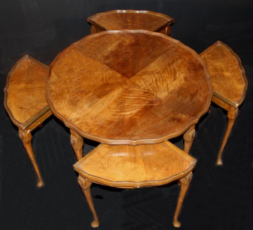 Dieses Art-Deco-Quartett von Tischen ist um 1920/30 datiert und hat eine schöne Farbe. Die Oberseite ist aus Walnussholz, äußerst praktisch und wunderschön. Eine fantastische Größe. Der obere Tisch ist kreisförmig mit viertel figurierter Nussbaumplatte und es gibt 4 dreieckige Tische, die darunter passen und so viele Anwendungen für eine Lounge bieten. wunderbar für zusätzliche Gäste, die ihr Weinglas irgendwo hinstellen müssen!