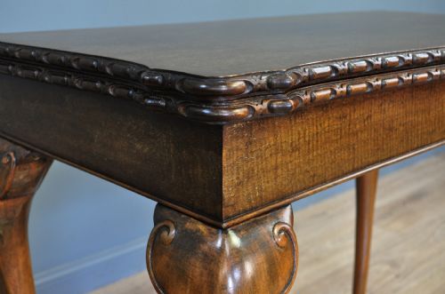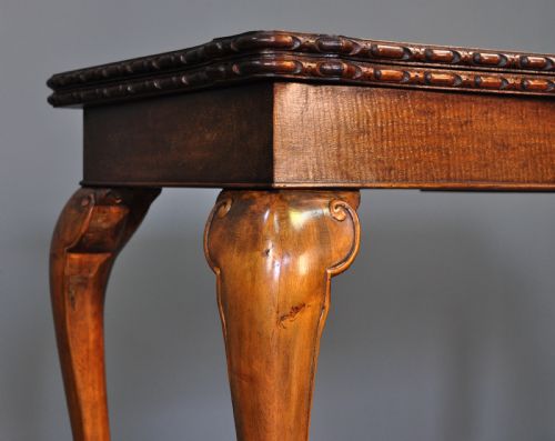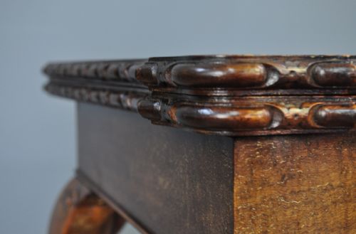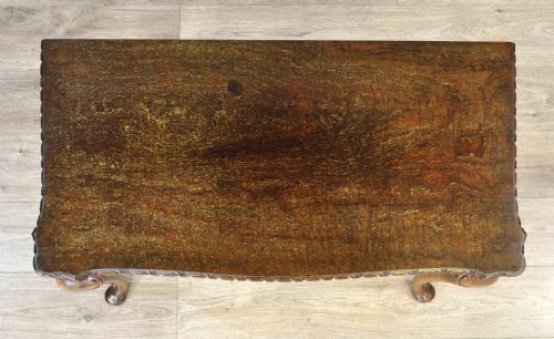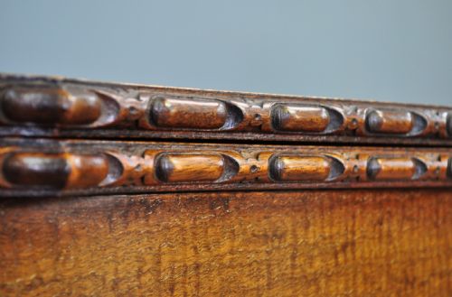 Die Haupttischplatte hat eine doppelte Dicke. Diese kann verdreht und dann umgeklappt werden, damit der Tisch in voller Größe verwendet werden kann. Die Tischplatte hat einen kunstvoll geschnitzten Rand.
