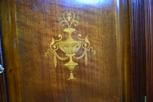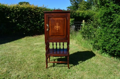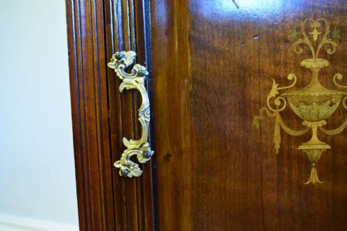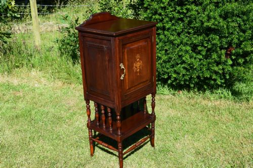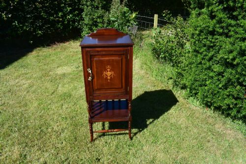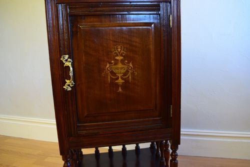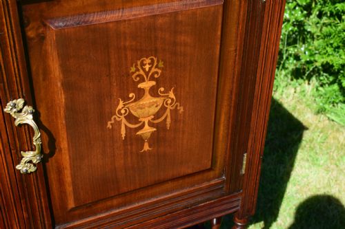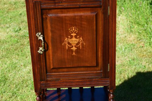 Hergestellt aus Mahagoni und gemischtem Holz, stehend auf 4 gedrehten und gespreizten Beinen, mit einem offenen Regal unter einem Schrankfach mit polierter Platte und hochstehendem Ständer und einer getäfelten Tür mit einer atemberaubenden Intarsien-Intarsie in der Mitte.