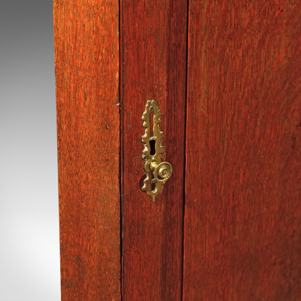 Dieser mittelgroße Schrank, der mit einer ansprechenden Patina in englischem Eichenholz gehalten ist, hat eine gewölbte Tür mit einem orientalischen Einfluss in seiner gewölbten Decke, eine massive Messing-Schlossrosette.